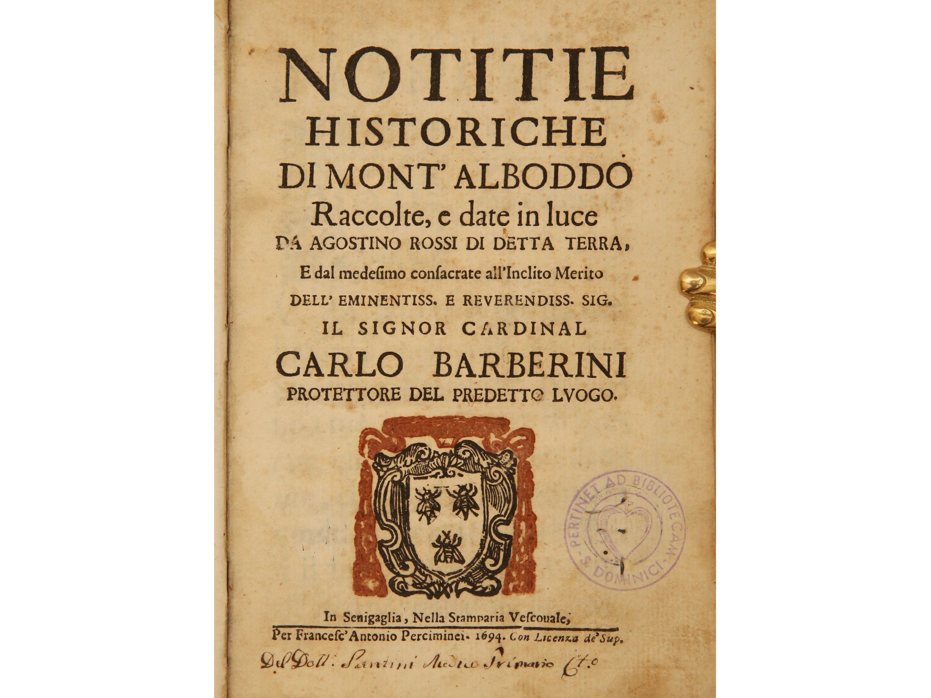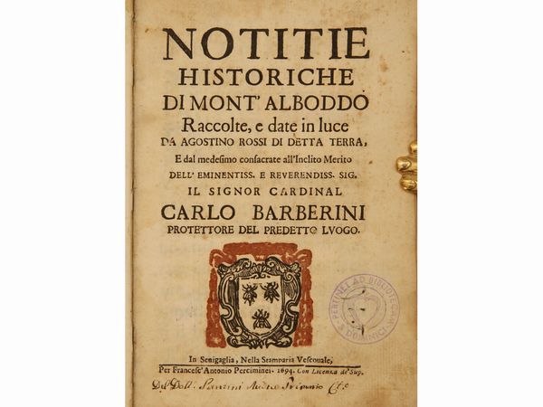 In Senigaglia: Nella Stamparia Vescovale Per Francesc'Antonio Perciminei, 1694, XXIV, 140 p. In-4º (190x130 mm). ...raccolte, e date in luce da Agostino Rossi di detta terra, e dal medesimo consacrate all'inclito merito dell'eminentiss. e reverendiss. sig. il signor cardinal Carlo Barberini protettore del predetto luogo. Mancante la tav. all'antiporta raffigurante San Gaudenzio. Frontespizio con stemma del dedicatario impresso in rosso e nero. Due tavole xilografiche nel testo. Legatura non coeva in mz. pelle con titolo in oro su tassello al dorso. Qualche fioritura e piccole macchie. Rara prima edizione