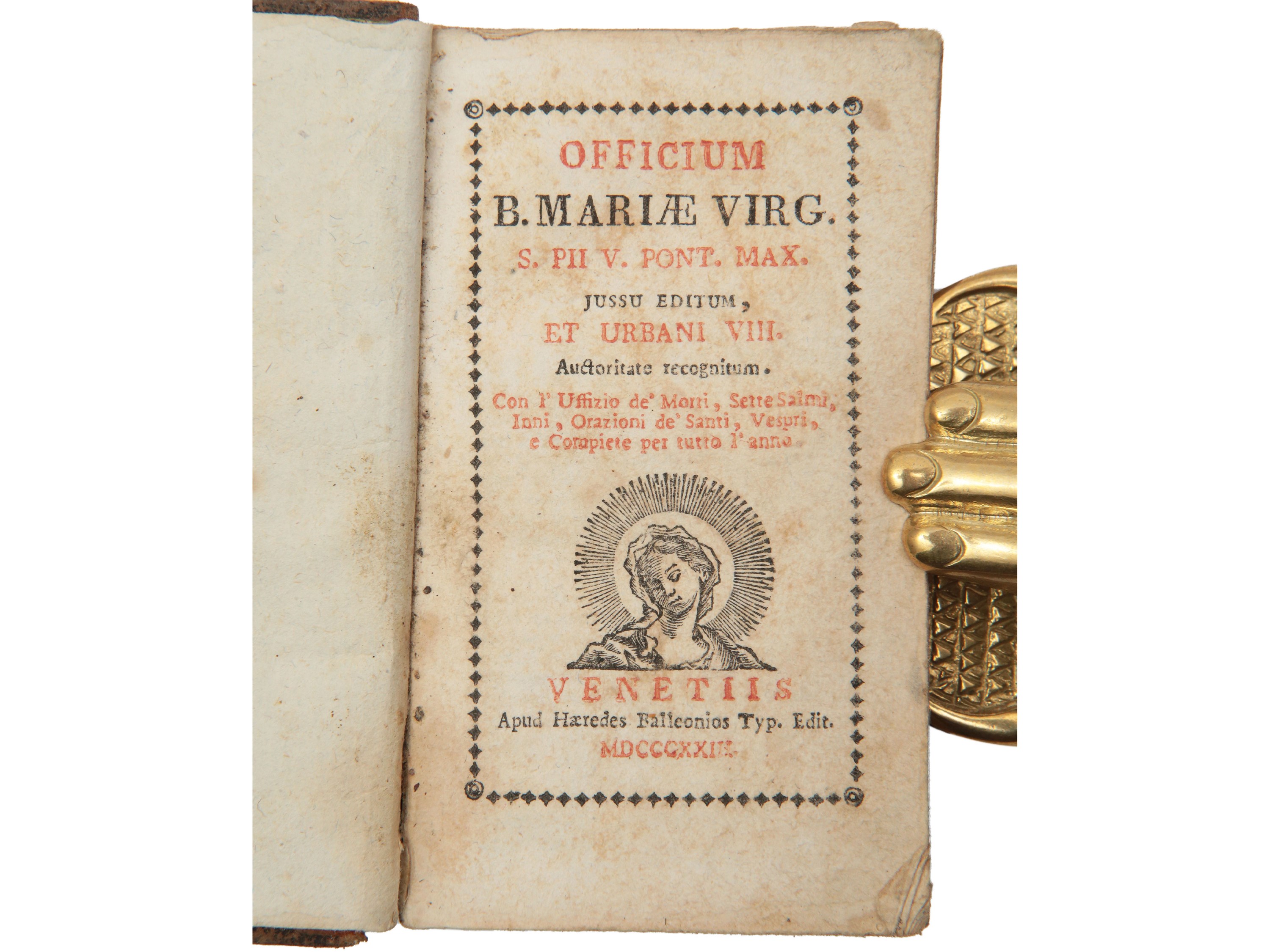 Con cinque incisioni di carattere religioso nel testo. Frontespizio con piccola incisione raffigurante Maria e testo interamente stampato in rosso e nero. Legatura coeva muta in piena pelle con fregi dorati ai piatti e ai dorsi, difetti. Tagli dorati. Fioriture e bruniture, piccole macchie