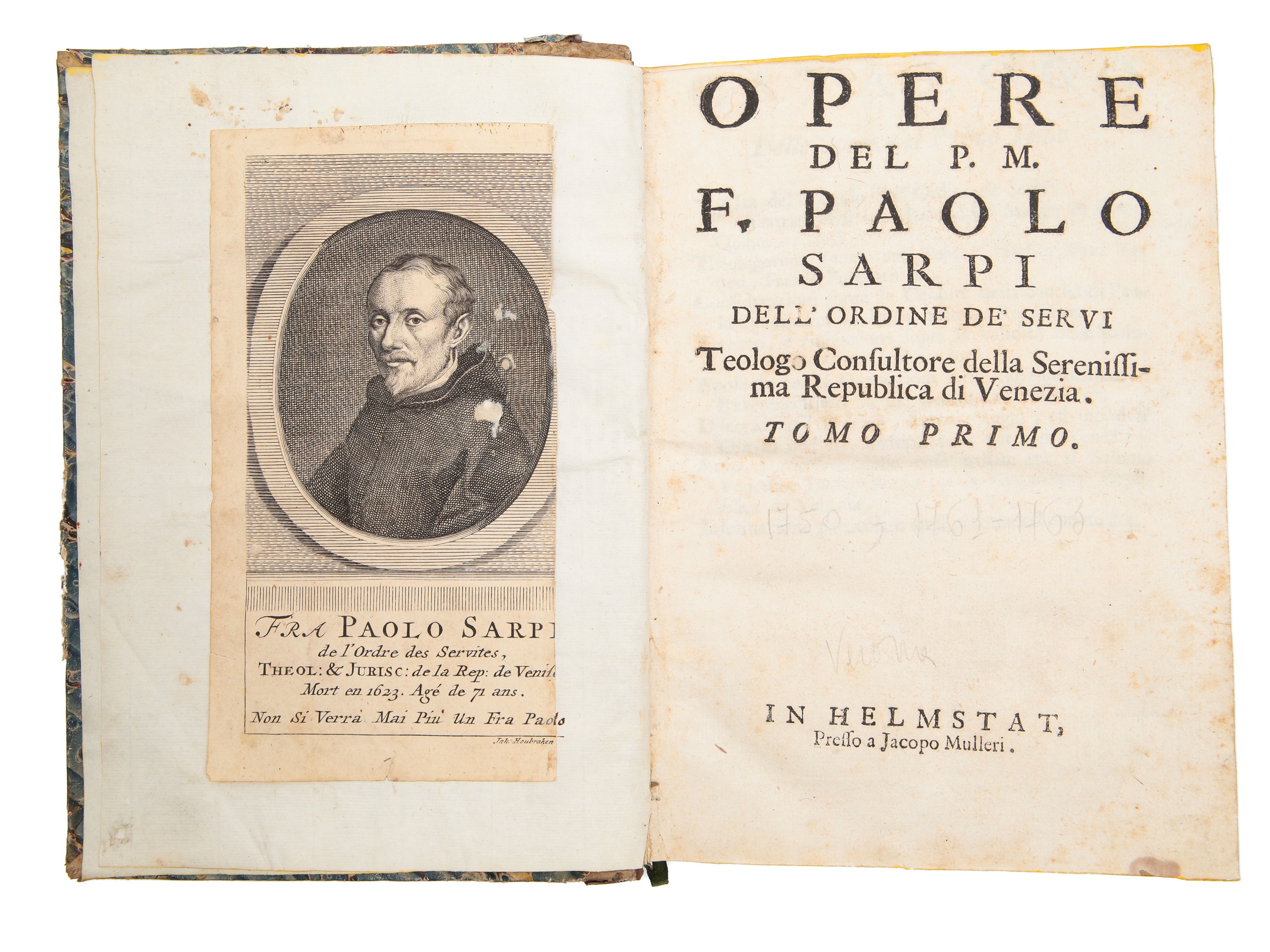 Legatura coeva in mz. pelle con titolo in oro al dorso. Segni d'uso, strappetti e spellature. Tagli gialli. Ritratto di Paolo Sarpi incollato all'antiporta. Lievi fioriture e arrossature, rare macchie