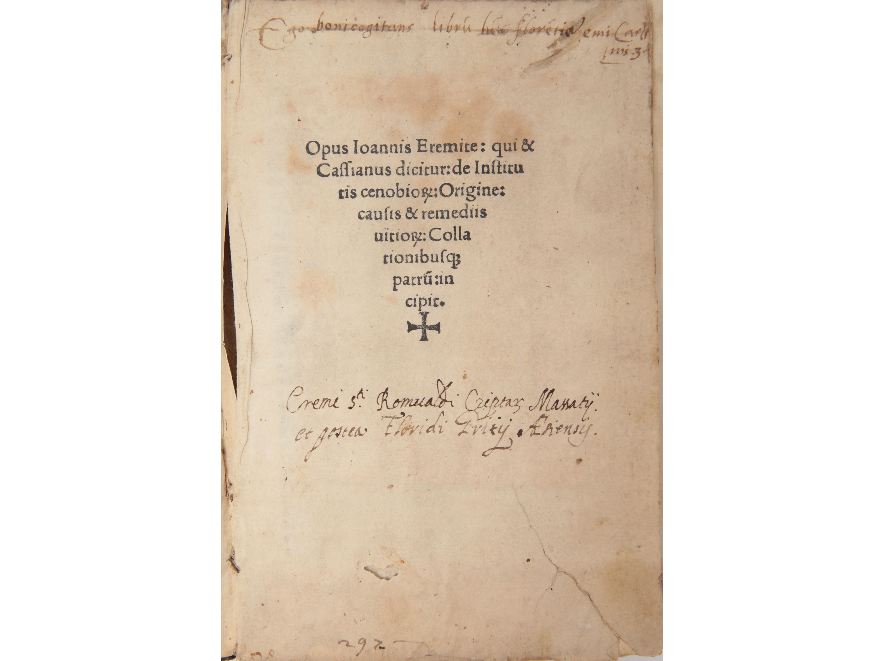Impresse Bononie: per Benedictum Hectoris bibliopolam bononiensem, 1521. die. 23. Martij. In-8° (165x110 mm). [312] c. ...de Institutis cenobiorum Origine causis & remediis uitiorum: Collationibusque patrum incipit. Legatura coeva in piena pelle con fregi a secco ai piatti, titolo su cartiglio al dorso. Difetti (segni d'uso, spellature, piccola menda, cerniere allentate). Galleria di tarlo a c. A1, con restauro, sul v. immagine incollata. Piccoli strappi a c. A6 e A8. Fascicoli f-o8 quasi totalmente staccati. Gore d'acqua. Spazi per capilettera con letterine guida, marca tipografica al recto dell'ultima carta