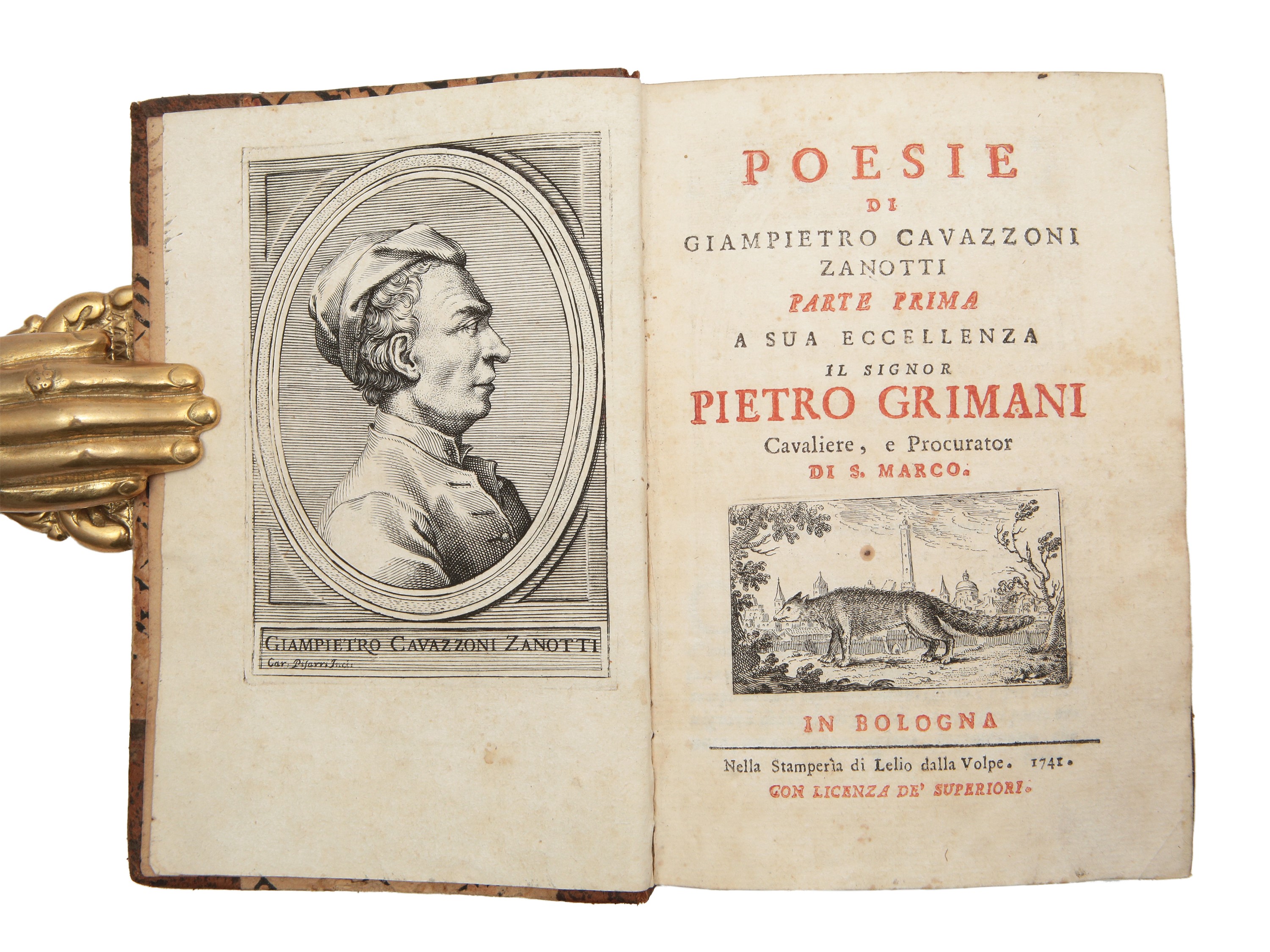 In Bologna: nella Stamperia di Lelio dalla Volpe, 1741, vol. 1 (di 3), 450, [2] p. Ritratto calcografico dell'Autore sottoscritto: Car. Pisarri incis. Frontespizio, con marca tipografica con la volpe, in rosso e nero. In-8° (175x120 mm). Finalini xilografici. Legatera in mz. pelle con angoli, con al dorso titolo in oro; al piatto anteriore Società degli immaturi in oro. Difetti. Interno fresco; rare piccole macchie