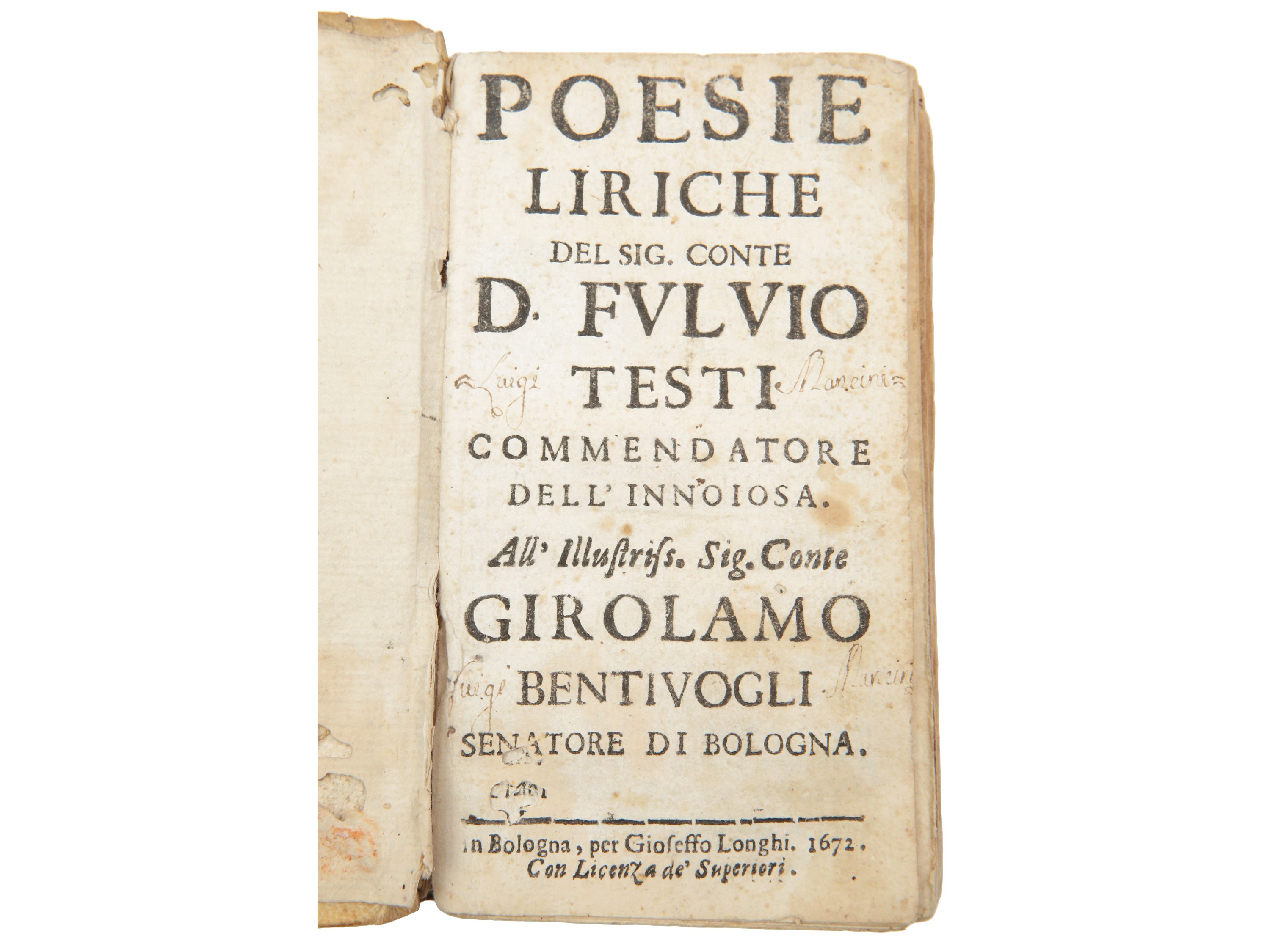 In Bologna: per Gioseffo Longhi, 1672. In-12° (135x70 mm). 633 p. (mancanti le 3 p. n.n. finali). A cura di Pietro Maria Monti, il cui nome figura in fine all'epistola dedicatoria, a c. A2v. Legatura coeva in piena pergamena con titolo manoscritto al dorso, con difetti macchie, mende, ecc.). Cerniere allentate. Fioriture, bruniture, gore d'acqua