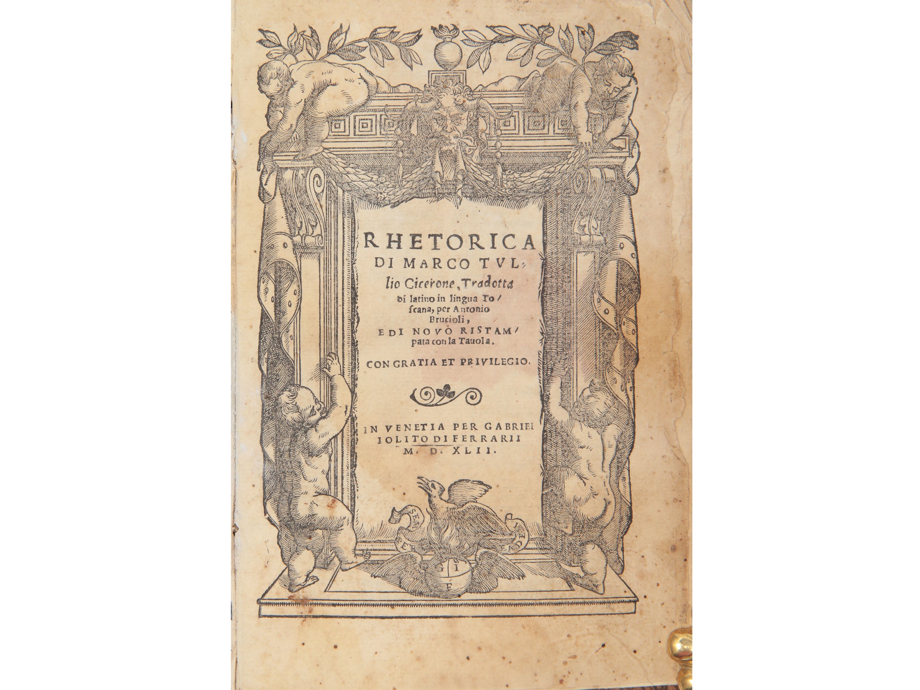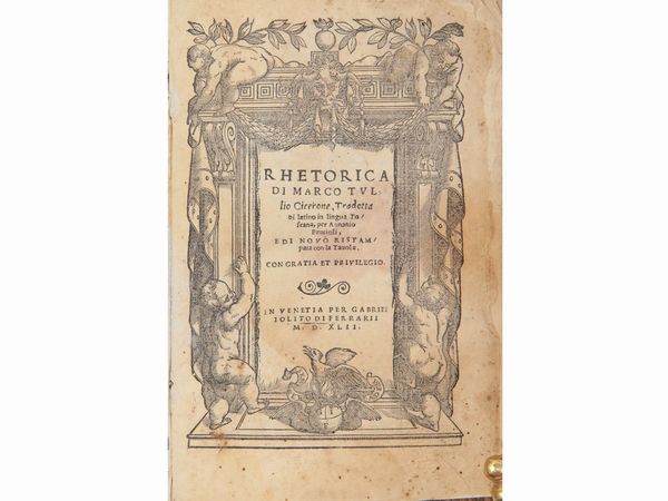 ...e di novo ristampata con la tavola In Venetia: per Gabriel Iolito di Ferrarii, 1542. In-8° (160x105 mm). 84 c. Frontespizio in cornice architettonica, iniziali xilografiche. Legatura in mz. pergamena. Gore d'umidità. Opera attribuita sia a Marco Tullio Cicerone sia a Cornificio