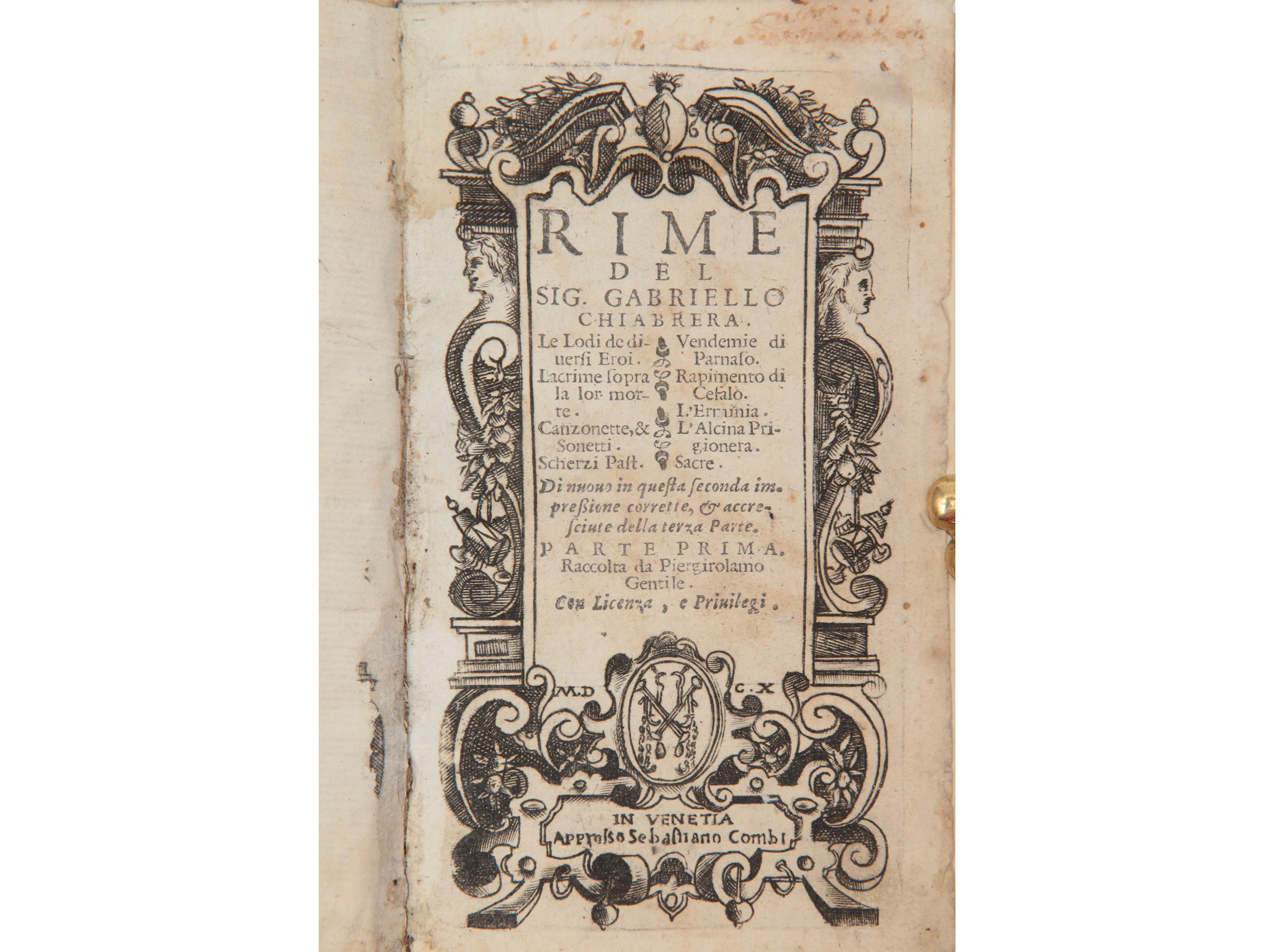 In Venetia: appresso Sebastiano Combi, 1610, 3 pt. in 1 vol. In-16° (135x70 mm). ...Le lodi de diuersi eroi. Lacrime sopra la lor morte. Canzonette, & sonetti. Scherzi past. Vendemie di Parnaso. Rapimento di Cefalo. L'Erminia. L'Alcinia prigioniera. Sacre. Di nuovo in questa seconda impressione corrette ed accresciute della terza parte. Parte prima raccolta da Piergirolamo Gentile: 237, [3] p. - Parte seconda raccolta da Giuseppe Pavoni: 180 p. - Parte terza nuovamente data in luce: 203, [1] p. Frontespizio in cornice architettonica. Testatine, finalini e iniziali xilografiche. A c. H9r inizia con frontespizio proprio: Egloghe di Gabriello Chiabrera nelle quali sotto nome di Tirsi Canta del Signor Iacopo Corsi. Legatura in piena pergamena muta non coeva. Rare macchie, lieve gora d'acqua