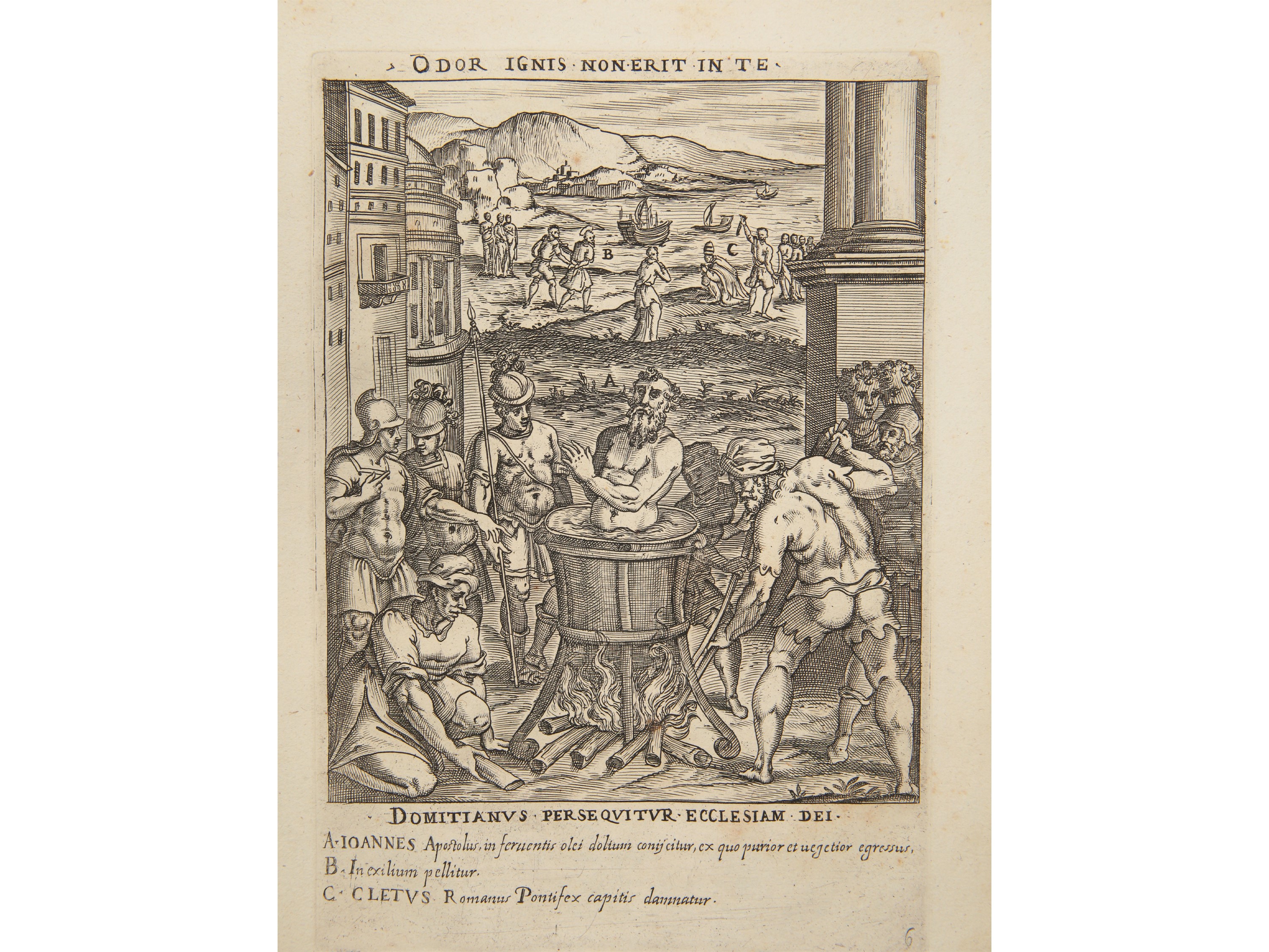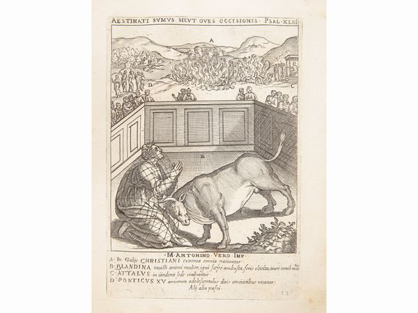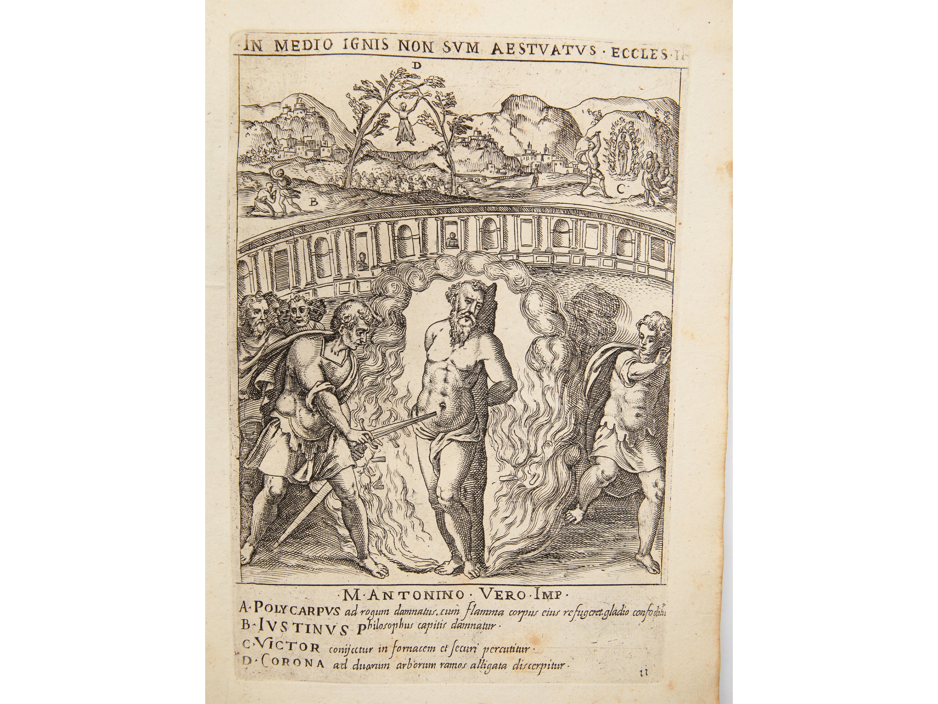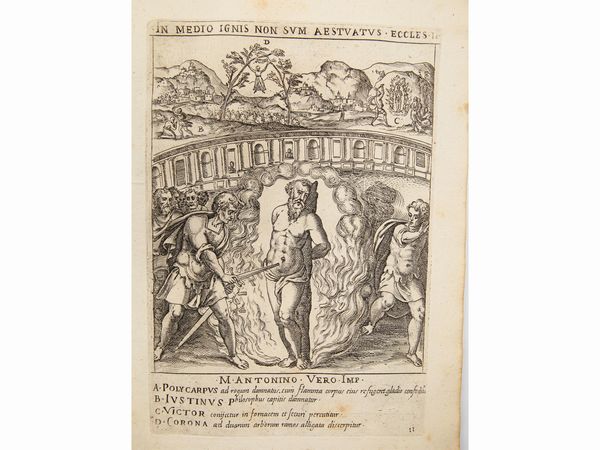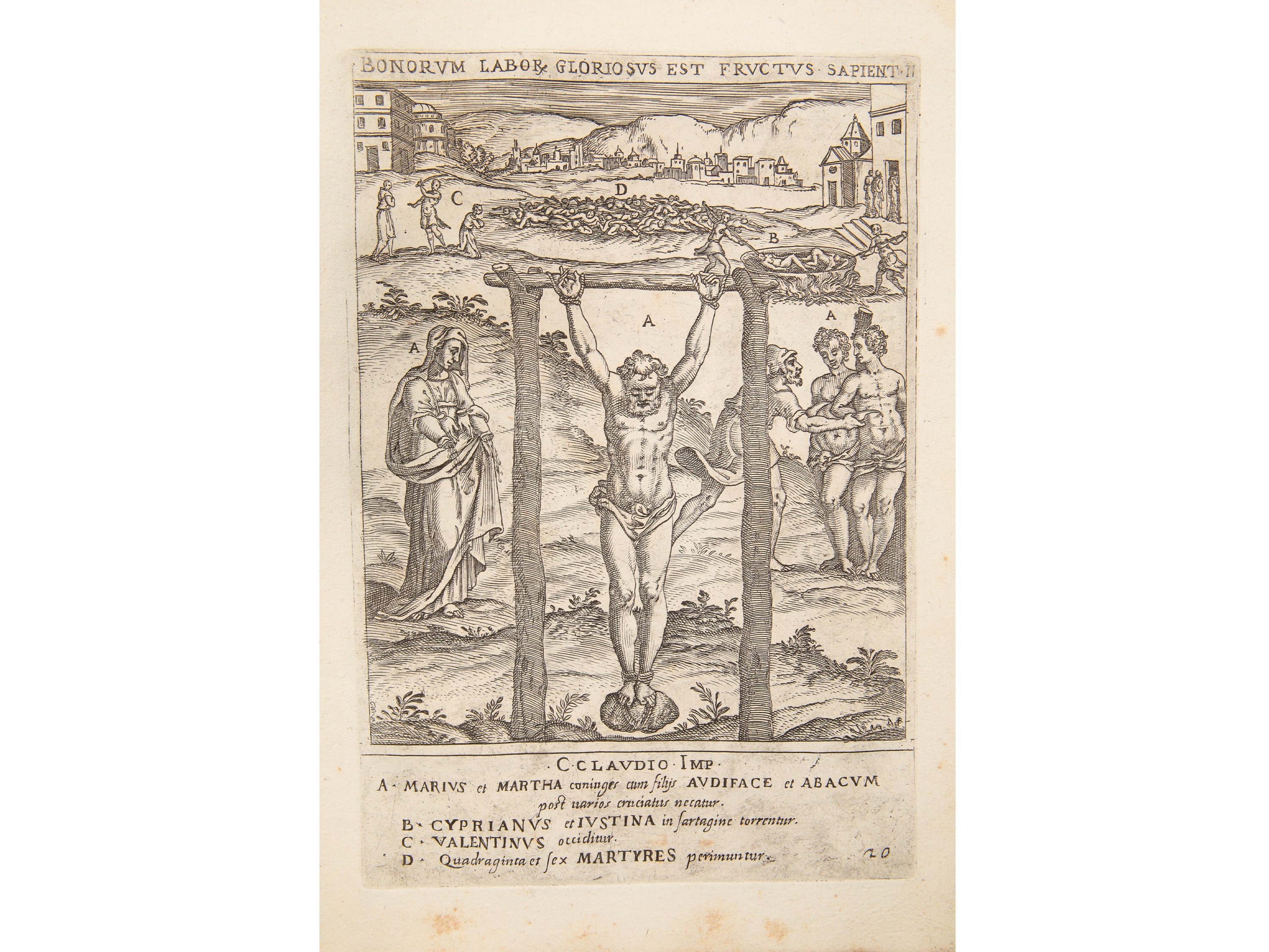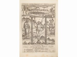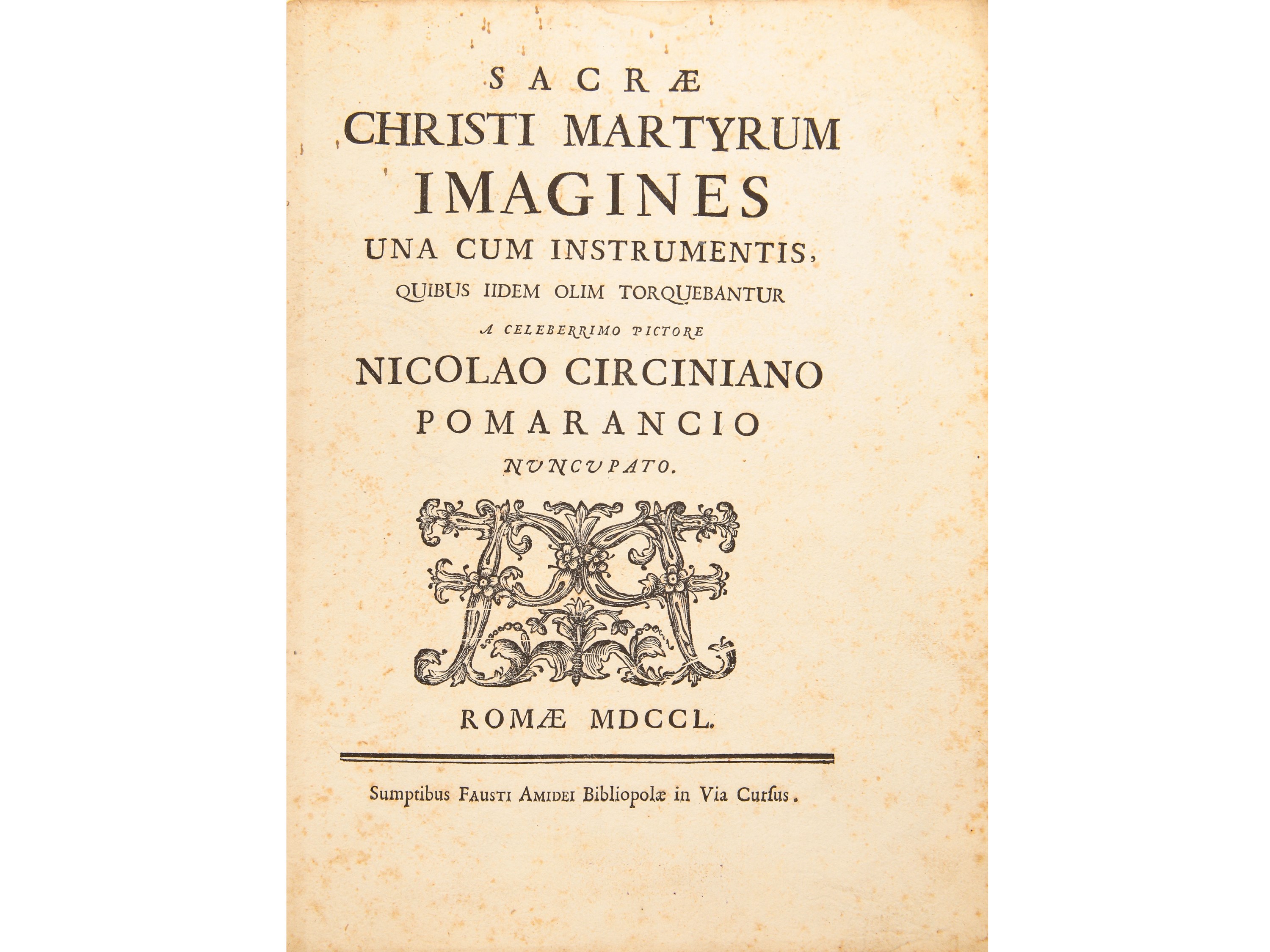 Romae: Fausti Amidei, 1750. In-4° (260x200 mm). [1] p. (frontespizio), 1 c. di tav., 31 tav. incise in rame numerate. ...una cum instrumentis, quibus idem olim torquebantur a celeberrimo pictore Nicolao Circiniano Pomarancio nuncupato. Legatura cartonata con macchie, staccata, fascicoli slegati; fioriture