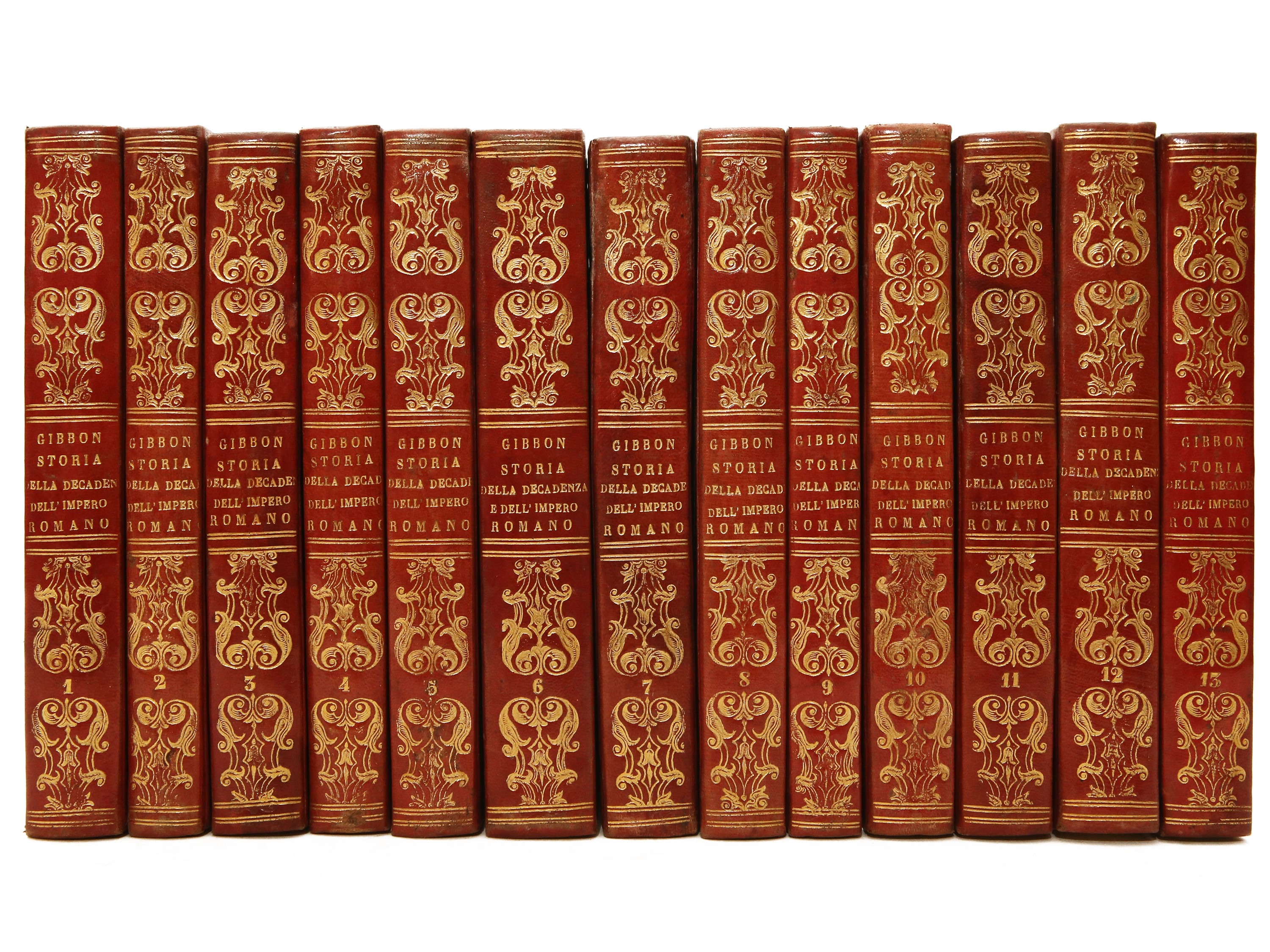 Legatura in mz. pelle con ricchi fregi e titoli in oro ai dorsi. Tagli gialli. Fioriture. Macchie di umidità nei volumi 7 e 11 (13)