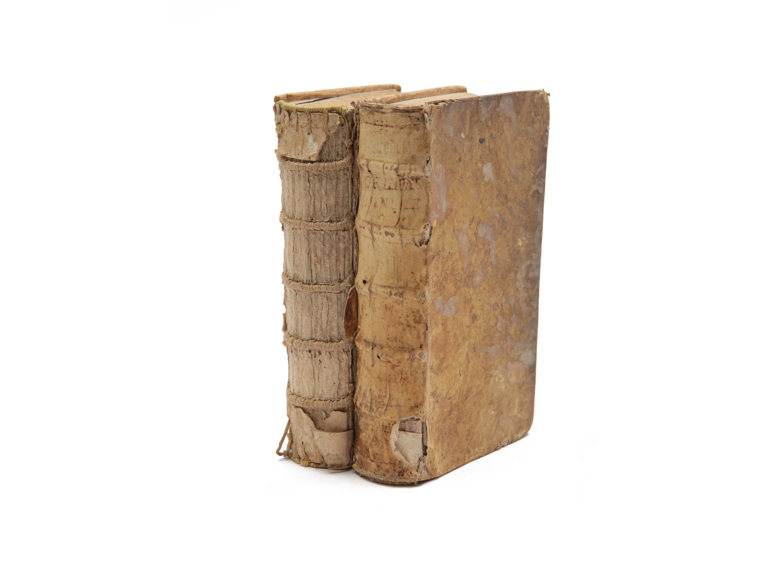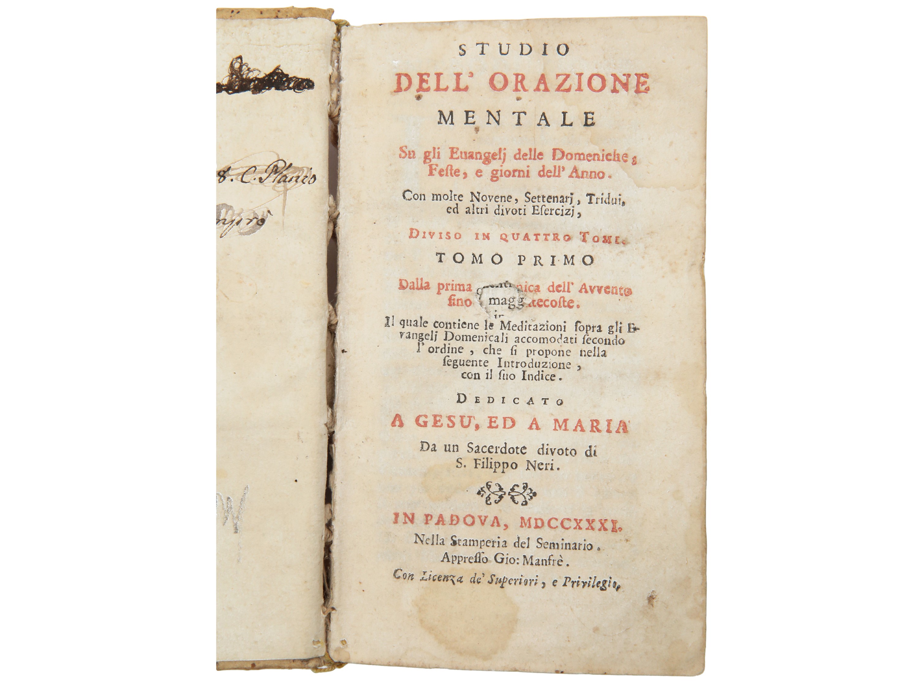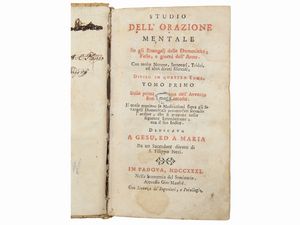 Tomo primo. Dalla prima domenica dell'Avvento fino alla Pentecoste: [72], 559, [1] p. - Tomo quarto. Che contiene le Meditazioni sulle Feste de' Santi anche novissime, Dal Primo di Agosto fino alla fine dell'Anno: [24], 580, [1] p. Frontespizio in rosso e nero. Legature coeve in pergamena con danni: tomo I senza il dorso e con foro al piatto anteriore che intacca anche le prime pagine del volume; macchie e mende. Gore d'acqua, fioriture (2)