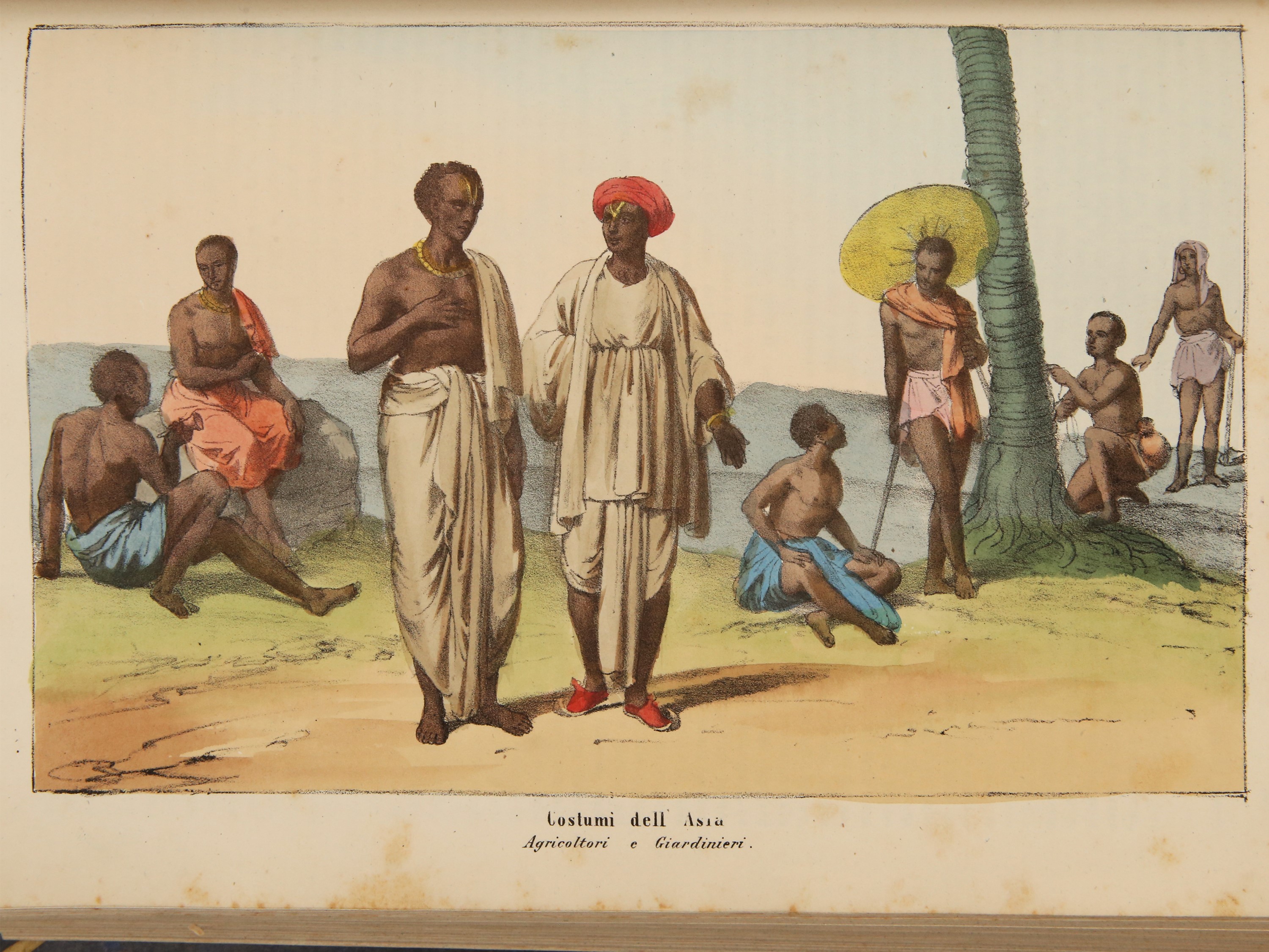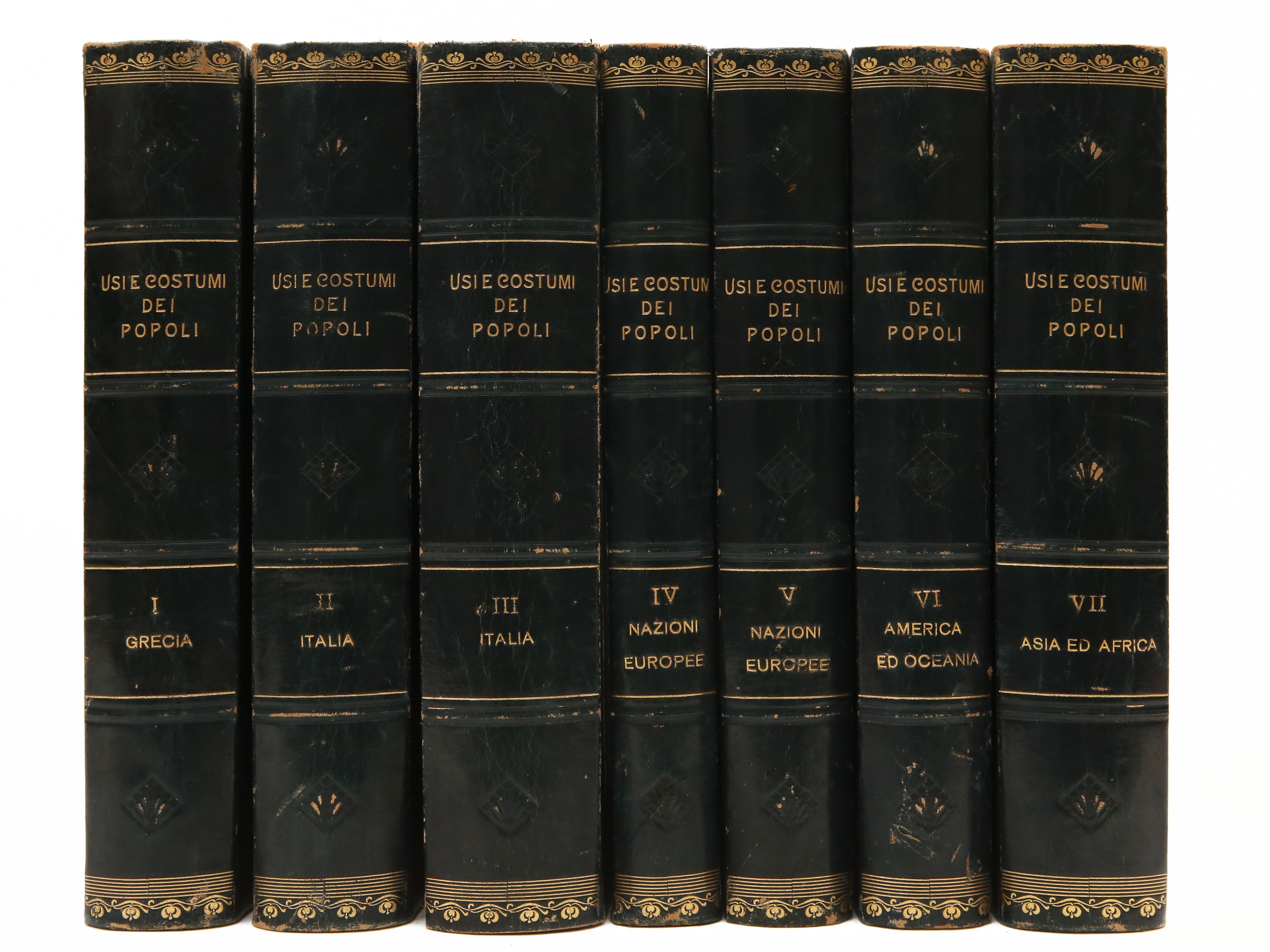 Milano: per Borroni e Scotti: [poi] Libreria di F. Sanvito, 1856-1862, 7 voll. ..ovvero Storia del governo, delle leggi, della milizia, della religione di tutte le nazioni dai più remoti tempi fino ai nostri giorni. Opera compilata da una società di letterati italiani sulle tracce di quelle di Aldini ... [et al.]. Comprende: 1. L' Europa: della Grecia - 2.1 L' Europa: dell'Italia - 2.2 L' Europa: dell'Italia - 3. L' Europa: dell'Italia insulare - 4. L' Europa: Francia, Inghilterra [...] - 5. America ed Oceania - 6. Asia rilegato con 7. Africa (con occhietto e pp. 1-64 manoscritte). Moltissime tav. in b/n e colorate n.t. e f.t. Molte tavole mancanti. Legature in mz. pelle con titoli in oro ai dorsi. Segni d'uso, spellature. Fioriture e bruniture diffuse (7)