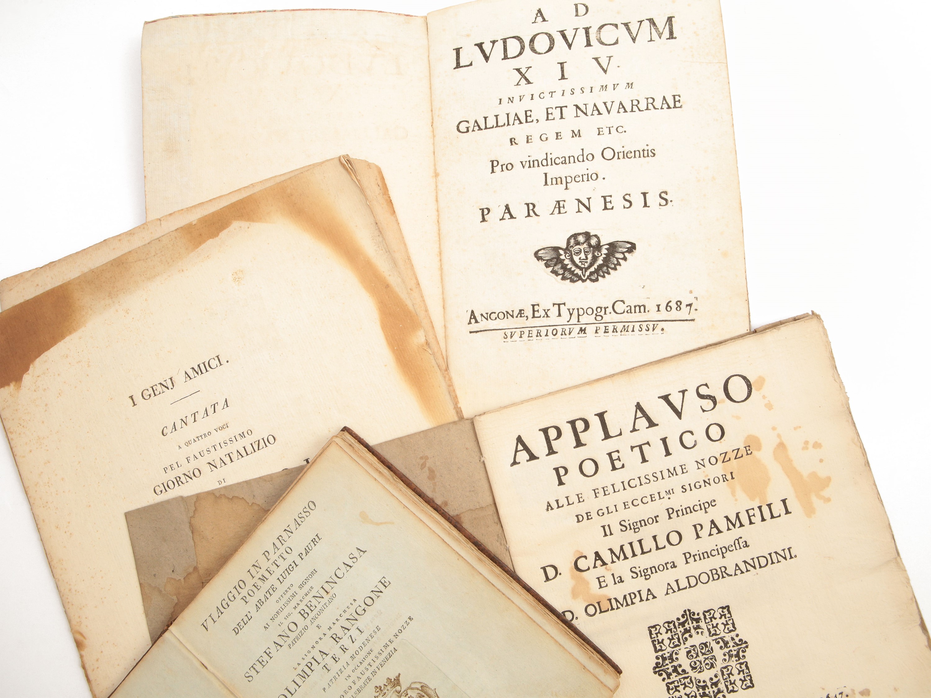 - Applauso poetico alle felicissime nozze de gli eccel.mi Signori il Signor Principe D. Camillo Pamfili e la Signora Principessa D. Olimpia Aldobrandini, In Rimini, Per Simbene Simbeni, 1647, 13 p. (gore d'acqua).