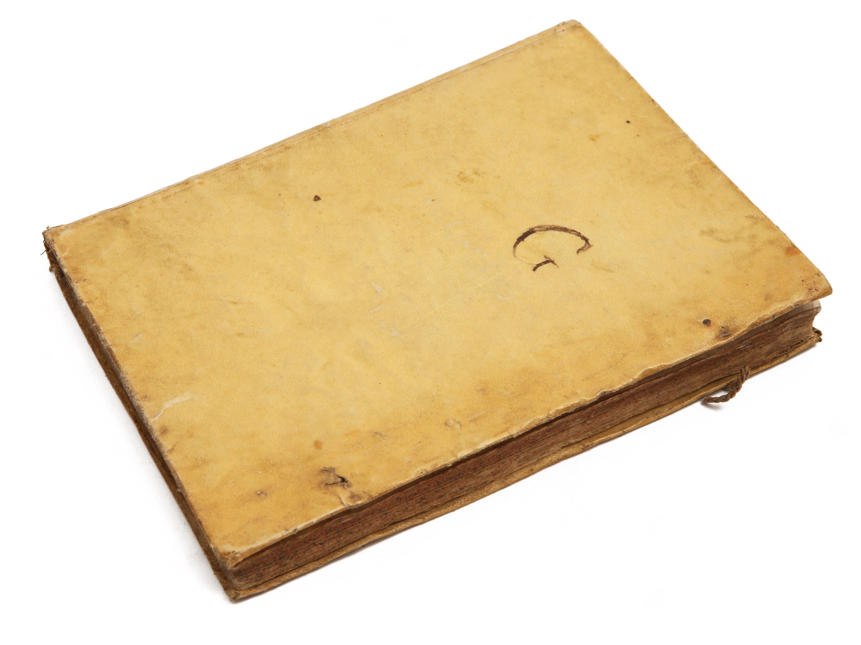 Legatura coeva in piena pergamena muta, con macchie, spellature e una G apposta al piatto posteriore. Tracce di antiche bindelle, parzialmente cadute. Qualche macchia, strappetti al frontespizio e alle 2 c. seguenti, gore, alcune carte uniformemente brunite, fioriture sparse