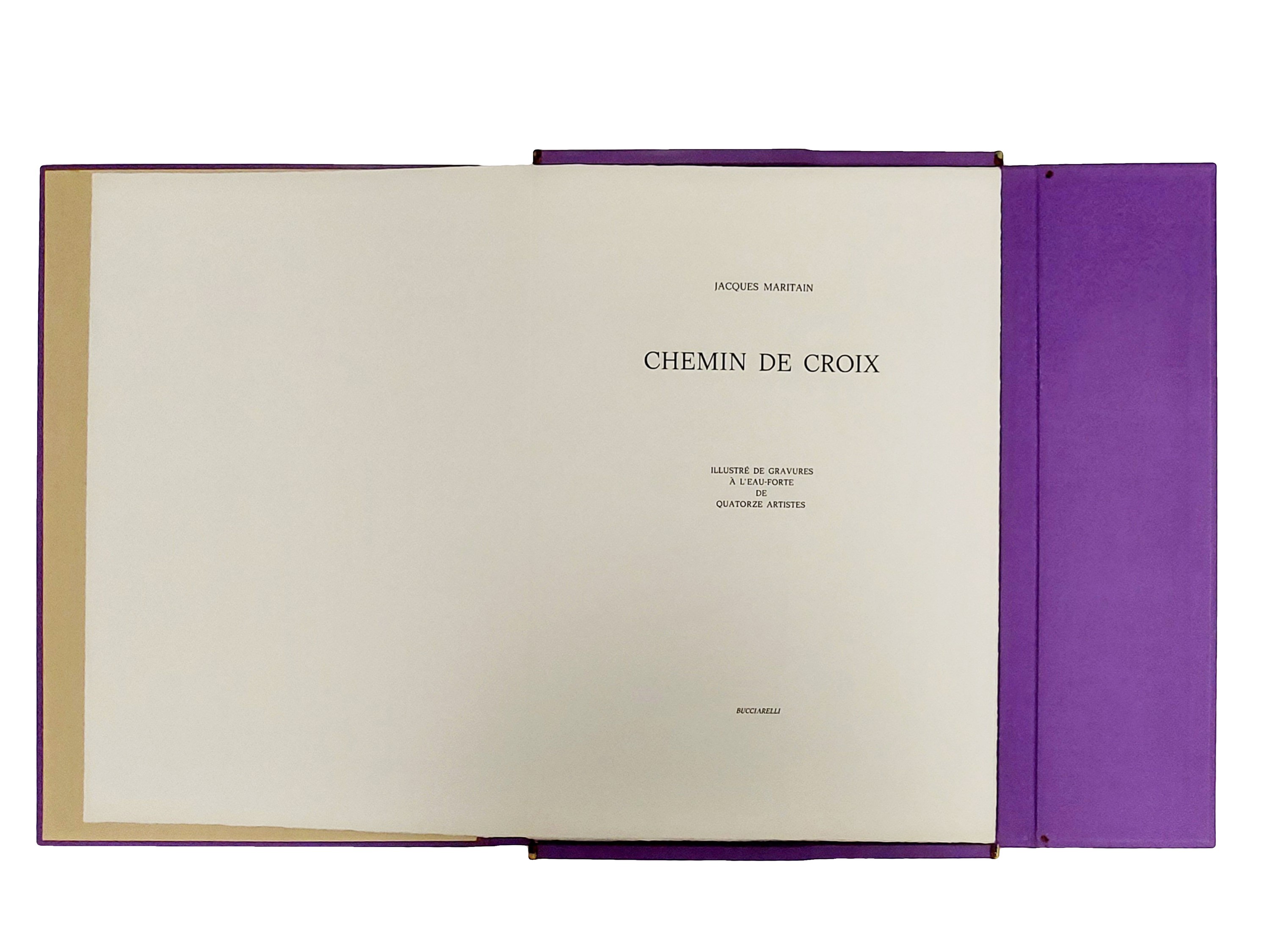 Illustré de gravures ŕ l’eau-forte de quatorze artistes, Bucciarelli, 1974. Fogli sciolti in cartella (500x350 mm) contenente un commento per ogni “stazione”, in francese, di Maritain e 14 acqueforti (200x180 mm), numerate e firmate, di: Carlo Cantalamessa, Walter Piacesi, Amerigo Tot, Raffaella Magliola, Cesco Magnolato, Virgilio Guidi, Trento Longaretti, Arnoldo Ciarrocchi, Fausta Beer, Enrico Manfrini, Valeriano Trubbiani, Dina Bellotti, Pericle Fazzini, Gastone Breddo. Es. n. 57/99 su carta Magnani di Pescia, entro custodia telata con tracce di muffa e di ruggine. Lievissime fioriture