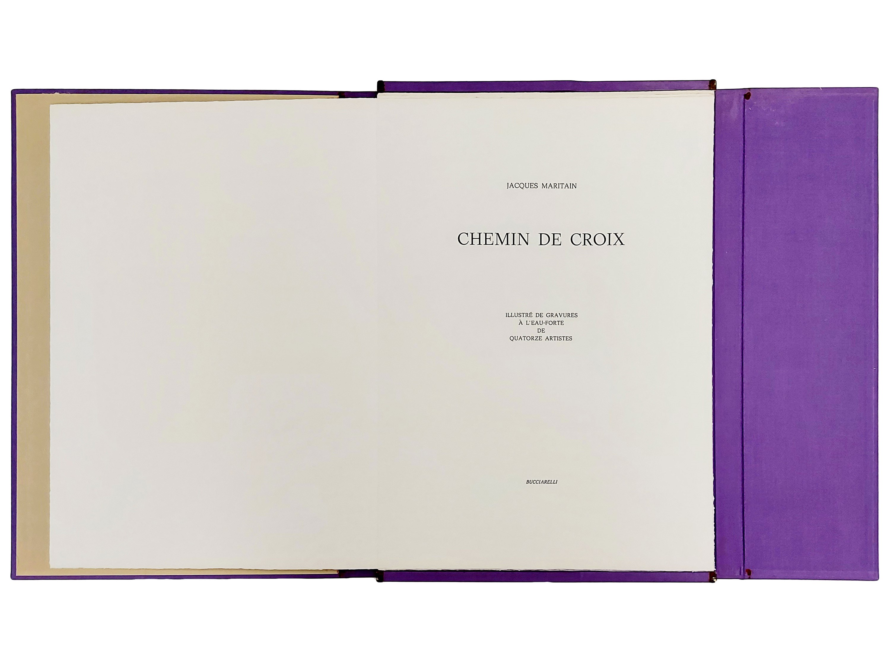Illustré de gravures ŕ l’eau-forte de quatorze artistes, Bucciarelli, 1974. Fogli sciolti in cartella (500x350 mm) contenente un commento per ogni “stazione”, in francese, di Maritain e 14 acqueforti (200x180 mm), numerate e firmate, di: Carlo Cantalamessa, Walter Piacesi, Amerigo Tot, Raffaella Magliola, Cesco Magnolato, Virgilio Guidi, Trento Longaretti, Arnoldo Ciarrocchi, Fausta Beer, Enrico Manfrini, Valeriano Trubbiani, Dina Bellotti, Pericle Fazzini, Gastone Breddo. Es. n. 91/99 su carta Magnani di Pescia, entro custodia telata con tracce di muffa e di ruggine. Lievi fioriture