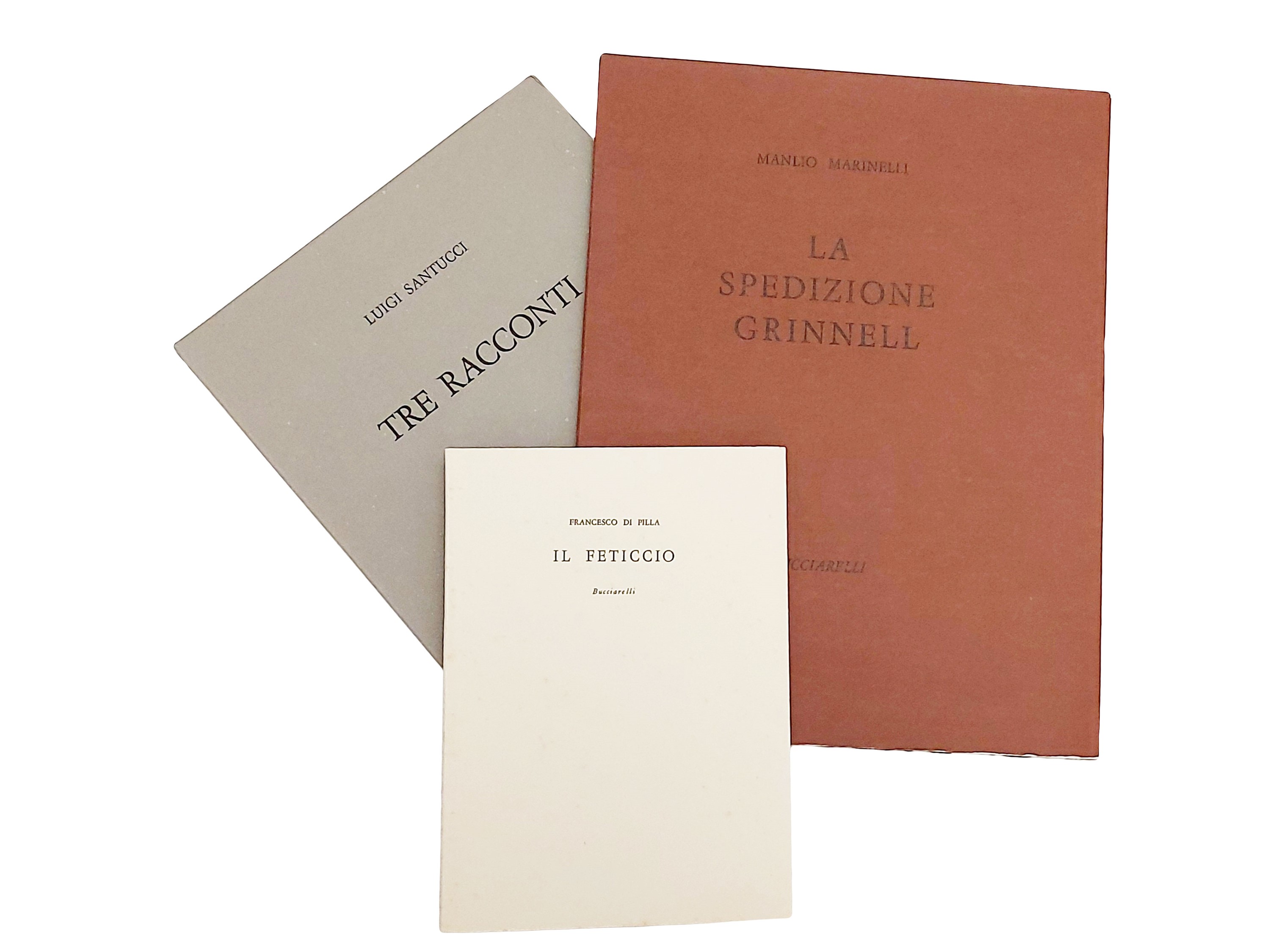 - Luigi Santucci, Tre racconti, Bucciarelli, 1970, 28 p. (260x180 mm). Con due acqueforti (180x110 mm), numerate e firmate, di Bruno Saetti, stampate al torchio con fondino giallo. Es. n. 7/150 carta di Fabriano filigranata “Umbria”. Lievi fioriture ai