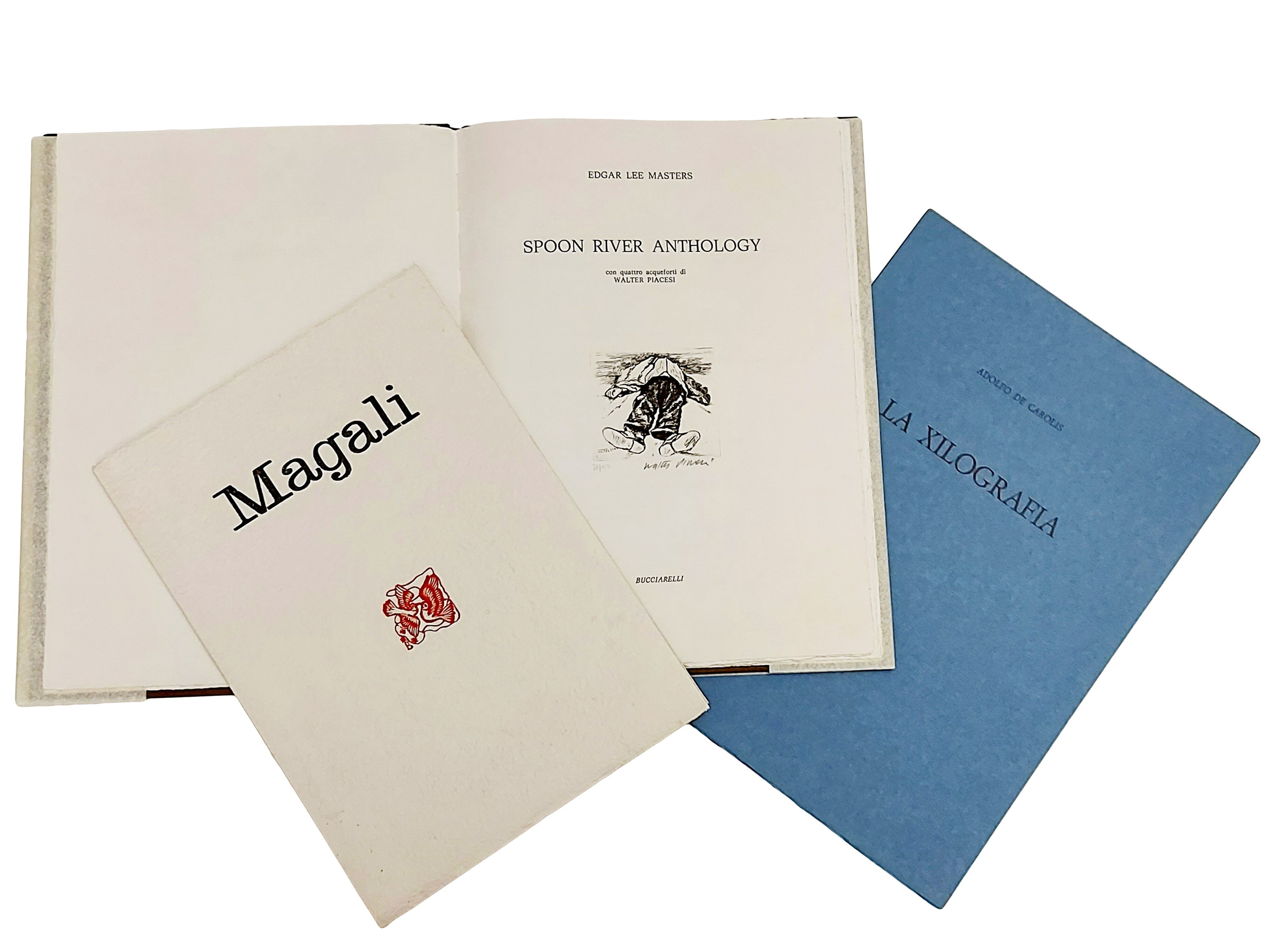 - Edgard Lee Masters, Spoon River anthology, Bucciarelli, 1977, 27 p. (360x26 mm). Con quattro acqueforti originali (150x210, 150x250, 190x270, 80x70 mm) numerate e firmate, di Walter Piacesi. Es. n. 38/150 su carta a mano “Umbria”. Rilegatura in cartone pesante e tela marrone con impressioni in oro e sovracoperta in carta pergamenata.
