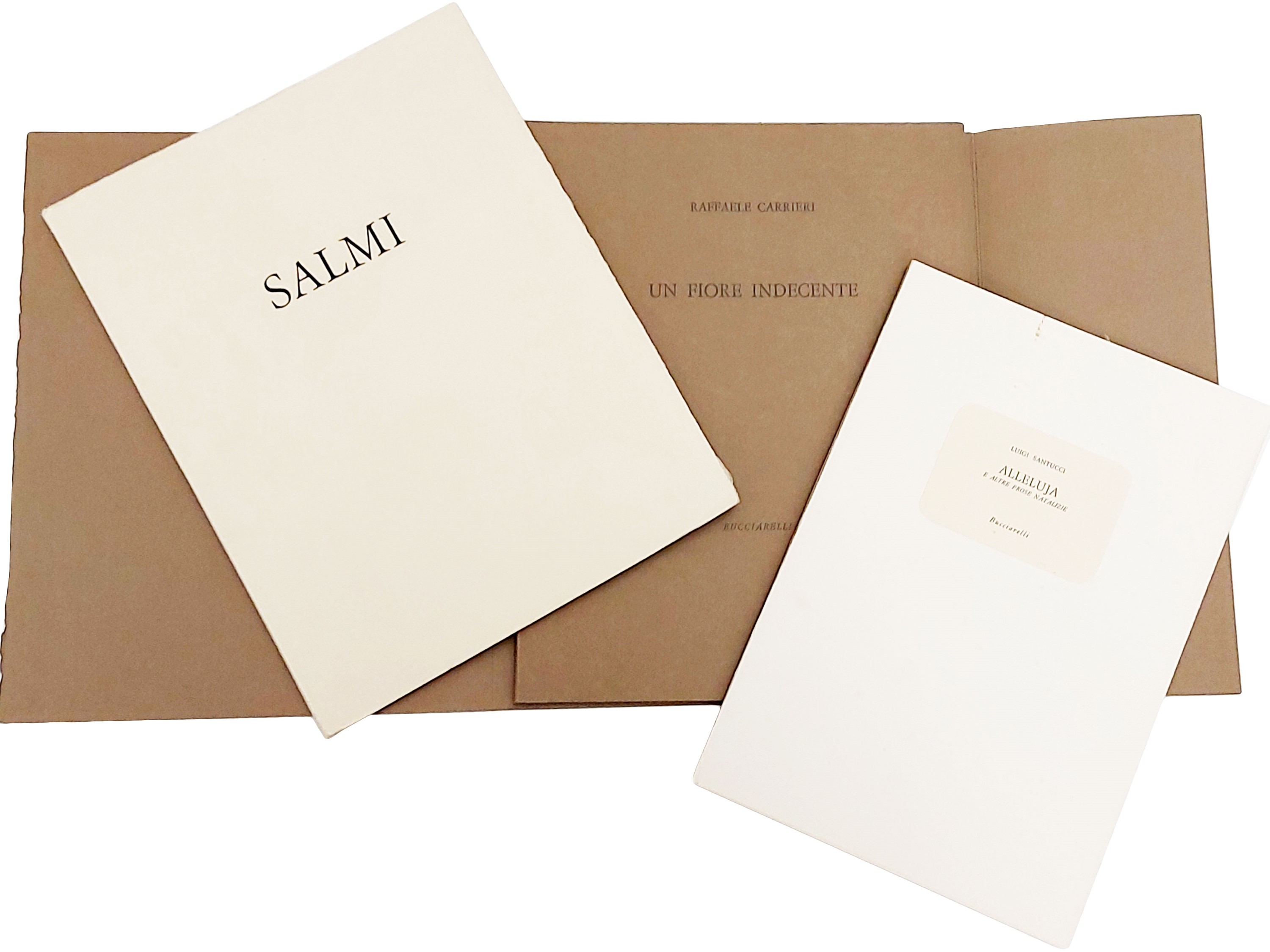 - Luigi Santucci, Alleluja e altre prose natalizie, Bucciarelli, 1966, 44 p. (265x180 mm). Con una acquaforte originale (160x100 mm) numerata e firmata, di Virgilio Guidi, stampata al torchio con fondino giallo, Es. n. 9/150 su carta a mano Fabriano filigranata “Umbria”. Lievi fioriture e piccole macchie.