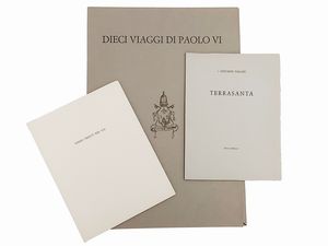 contiene: - Dieci viaggi di Paolo VI, Bucciarelli, 1973, con 10 acqueforti (200x200 mm) numerate e firmate, di [..]