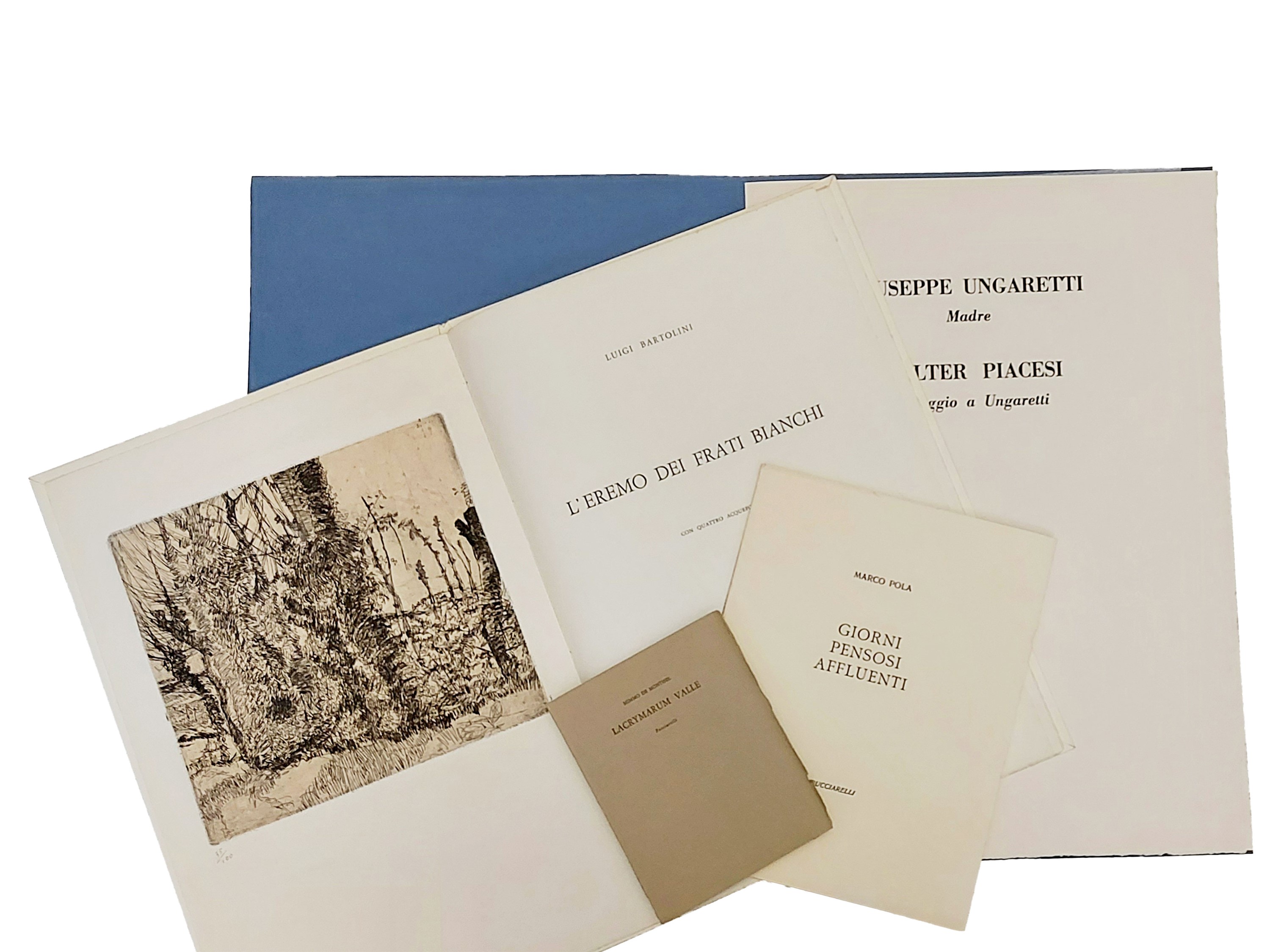 - Marco Pola, Giorni pensosi affluenti, Bucciarelli, 1969, 28 p. (280x215 mm). Con 3 acqueforti (165x100, 170x127, 165x96 mm) numerate e firmate, di Walter Piacesi. Es. n. 129/150 su carta a mano Fabriano (4)