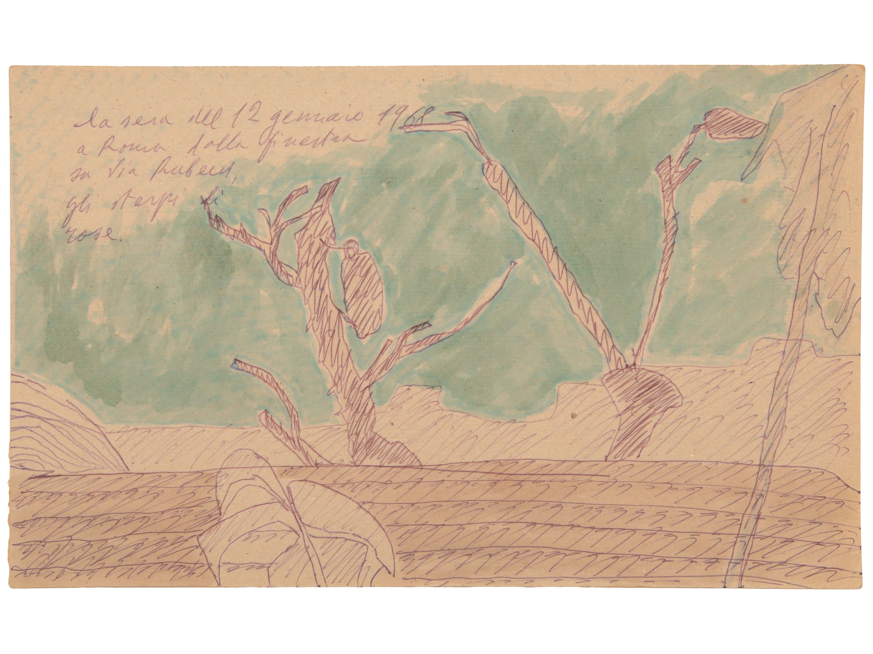 acquerello e penna su cartoncino, firmato e datato, firmato, datato e dedicato al verso