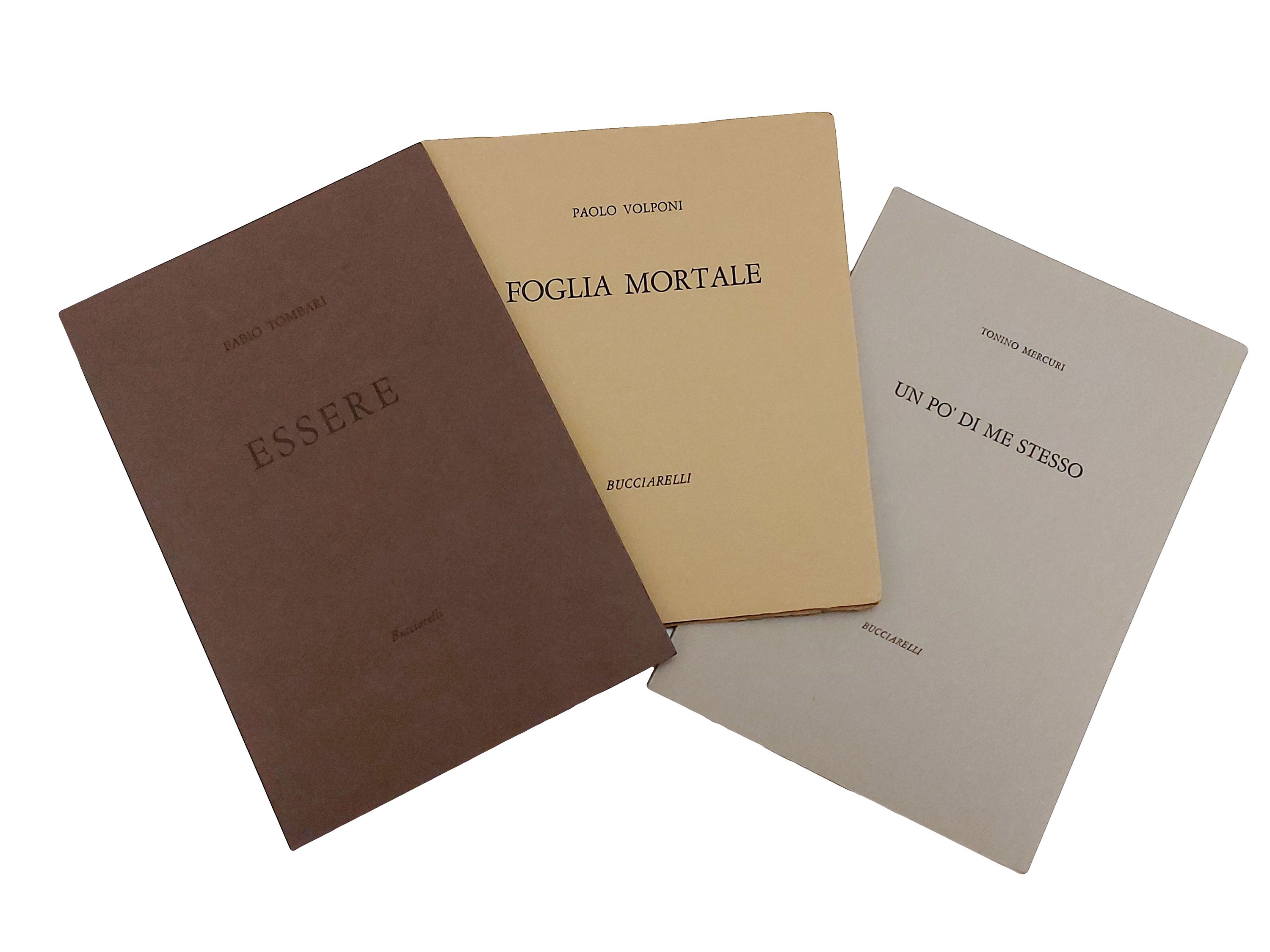 - Tonino Mercuri, Un po’ di me stesso, Bucciarelli, 1974, 44 p. (260x180 mm). Con cinque acqueforti originali, numerate e firmate, di Giorgio Ciummei, Giorgio Di Venere, Cesco Magnolato, Walter Piacesi, Valeriano Trubbiani (rispettivamente 150x120, 95x125, 160x125, 152x110, 150x120 mm). Es n. 30/150 su carta a mano “Umbria” delle cartiere di Fabriano. Lievi fioriture ai tagli.