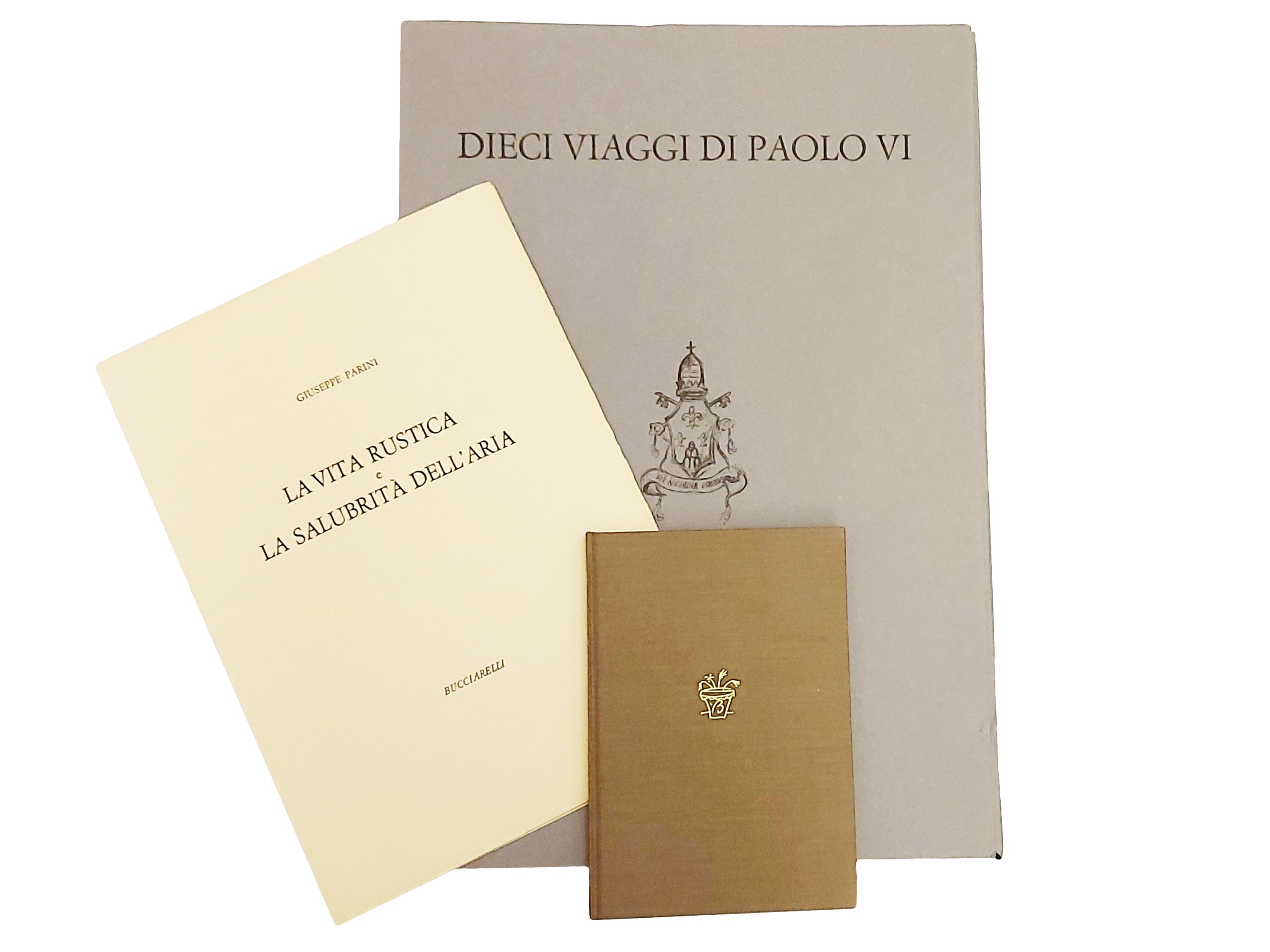 - Dieci viaggi di Paolo VI, Bucciarelli, 1973, con 10 acqueforti (200x200 mm) numerate e firmate, di Roberto Selluti, Luigi Toccaceli, Alfredo Bartolomeoli, Angelo Rosetti, Edgardo Travaglini, Adriano Calavalle, Claudio Polzonetti, Silvano Silvani, Nani Tedeschi, Mario Bellagamba. Ciascuna incisione, stampata al torchio su carta a mano della cartiera Magnani di Pescia, è custodita in un foglio dove è riprodotto un brano del discorso ufficiale di Paolo VI pronunciato in occasione del viaggio al quale si riferisce l’incisione. Le 10 acqueforti, con le loro parti tipografiche, sono raccolte in una cartella in cartoncino “Murillo” della cartiera Miliani di Fabriano (500x350 mm). Es. n. 69/99 (3)