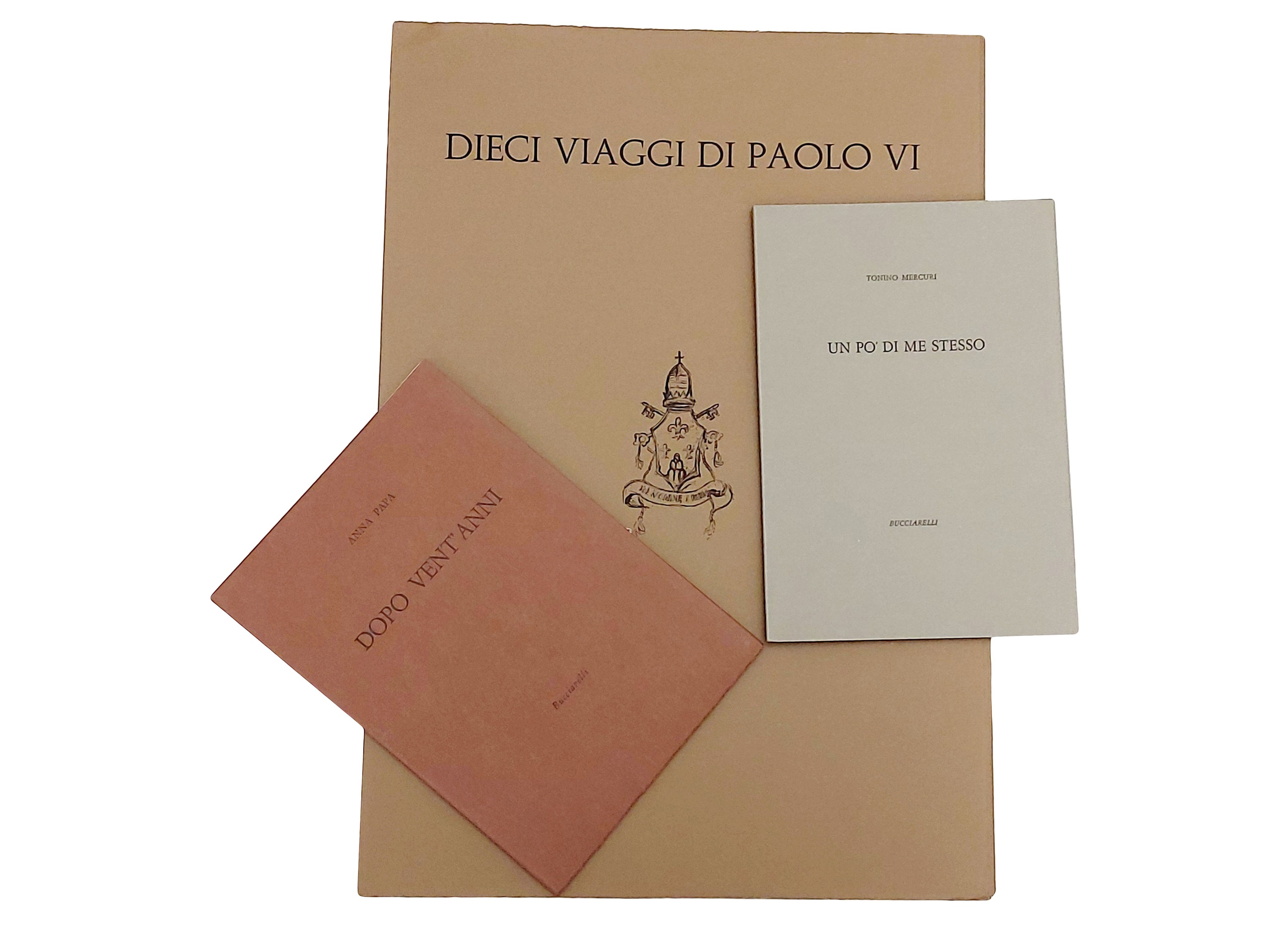 - Dieci viaggi di Paolo VI, Bucciarelli, 1973, con 10 acqueforti (200x200 mm) numerate e firmate, di Roberto Selluti, Luigi Toccaceli, Alfredo Bartolomeoli, Angelo Rosetti, Edgardo Travaglini, Adriano Calavalle, Claudio Polzonetti, Silvano Silvani, Nani Tedeschi, Mario Bellagamba. Ciascuna incisione, stampata al torchio su carta a mano della cartiera Magnani di Pescia, č custodita in un foglio dove č riprodotto un brano del discorso ufficiale di Paolo VI pronunciato in occasione del viaggio al quale si riferisce l’incisione. Le 10 acqueforti, con le loro parti tipografiche, sono raccolte in una cartella in cartoncino “Murillo” della cartiera Miliani di Fabriano (500x350 mm). Es. n. 64/99.