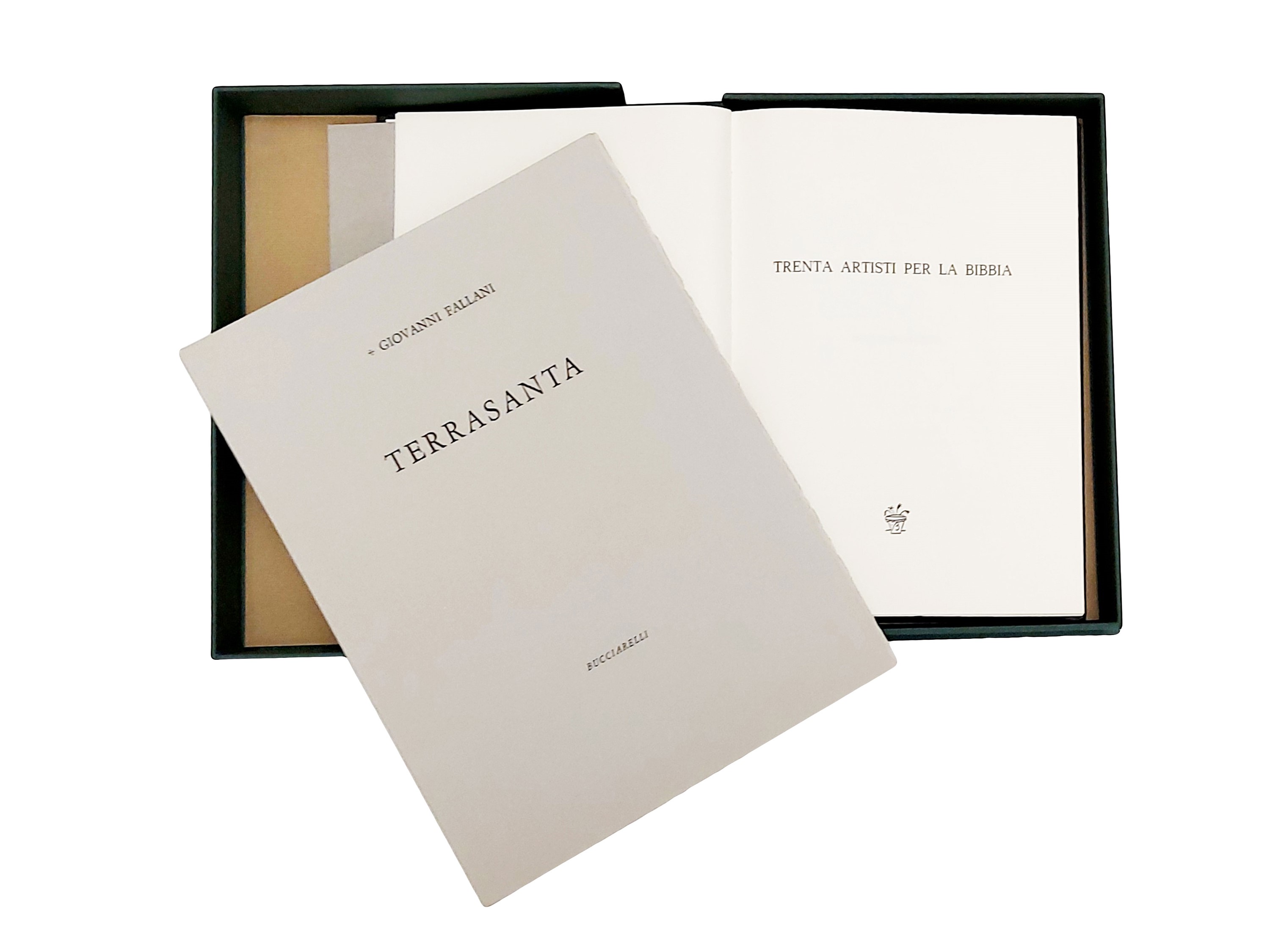 - Giovanni Fallani, Terrasanta, Bucciarelli, 1970, 58 p. (300x220 mm). Con tre acqueforti originali (150x195 mm) numerate e firmate, di Pericle Fazzini. Es. n. 78/150 su carta “Classico” di Fabriano, composto a mano con carattere “Garaldus” (2)