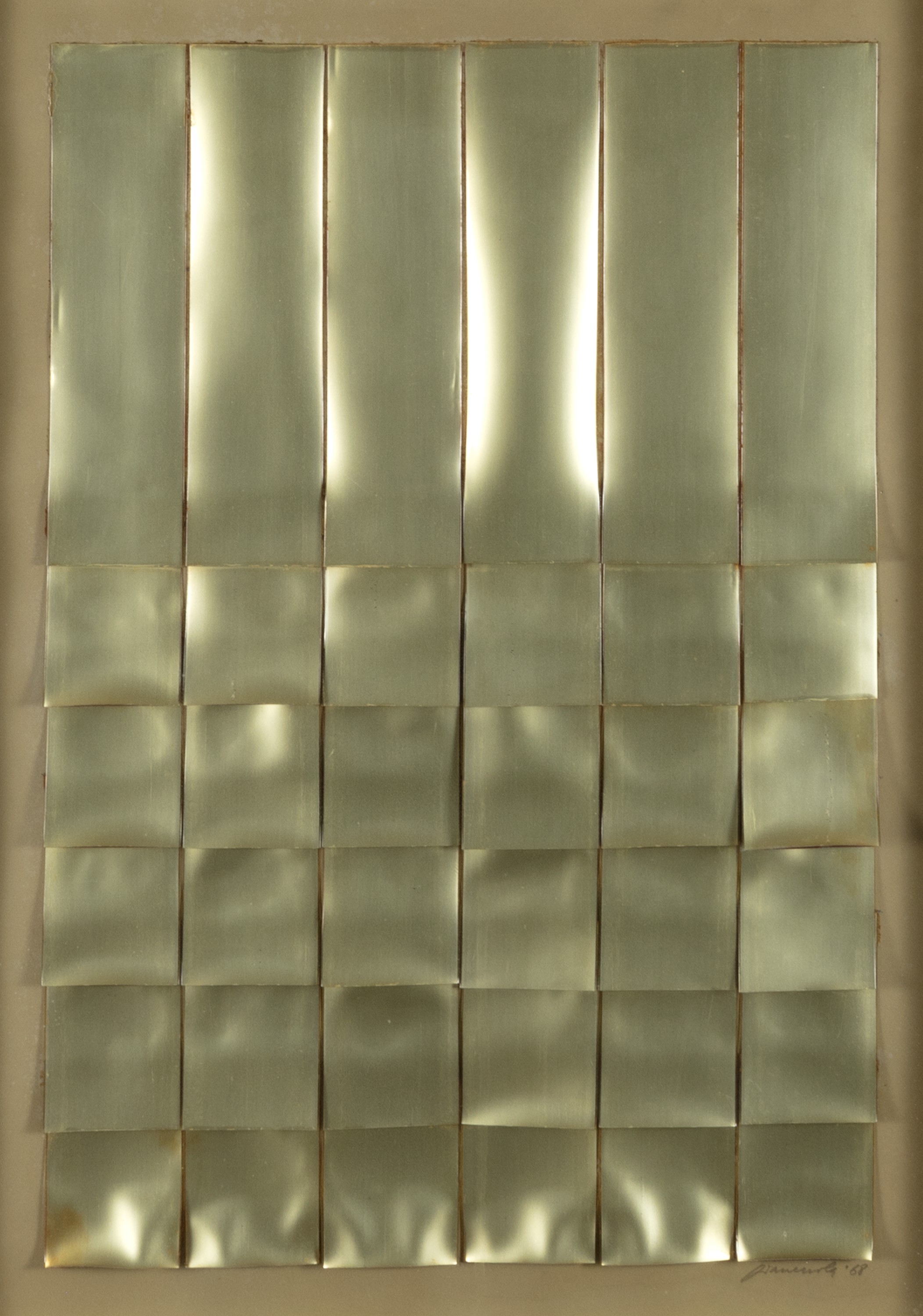 lamiera in acciaio dorato entro teca, cm 73 x 53