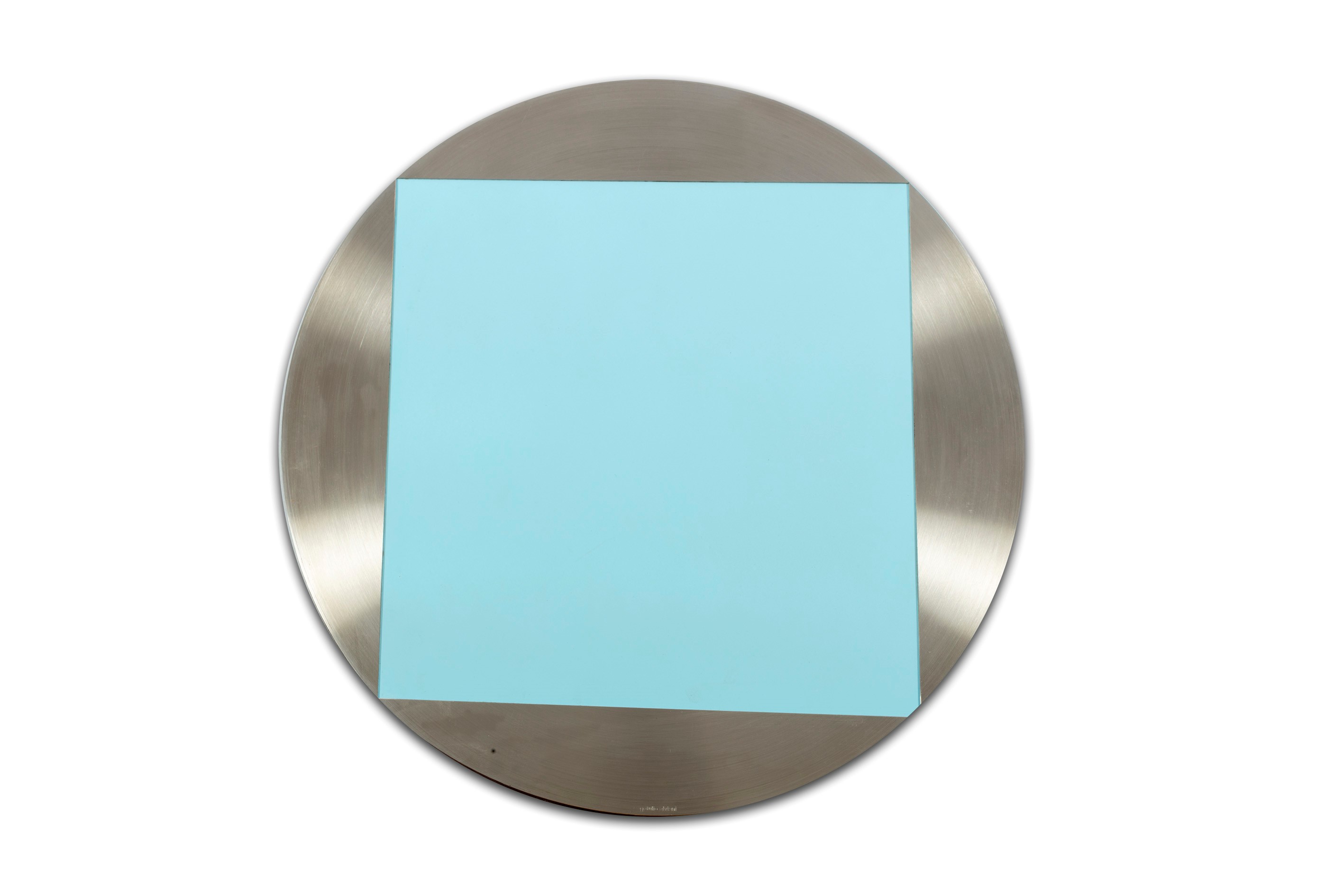 Firmato al verso: Getulio Alviani, Quadrato azzurro, prova cromatica su acciaio, 1972
