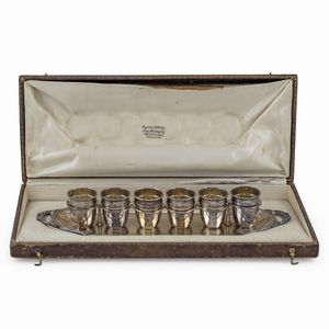 4x29x9 cm. Francia, primi anni del XX Sec. orafo Louis Garnier, composto da sei bicchierini ed un vassoio, entro [..]