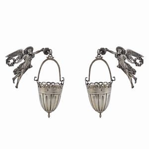 18x13x8 cm. Roma, XIX Sec. sostegni da parete in argento cesellato a raffigurare due angeli, coppe in argento [..]