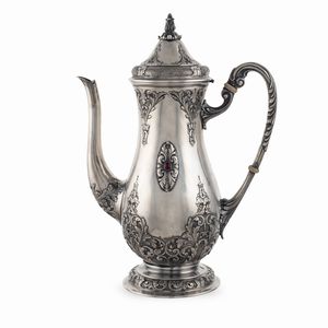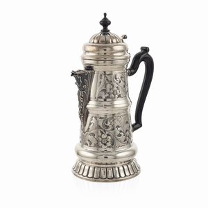 h. 30 cm. Roma, XIX Sec. corpo sfaccettato e cesellato con motivi vegetali, manico a voluta in legno, presa del [..]
