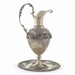 caraffa h. 40 cm.- bacile d. 27 cm. Italia, XX Sec. caraffa con base circolare, corpo bombato con superficie [..]