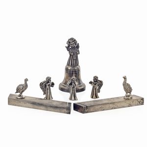 h. massima 7,5 cm. XX Sec. composto da: 6 segnaposto a foggia di angeli musicanti 6 segnaposto a foggia di animali [..]