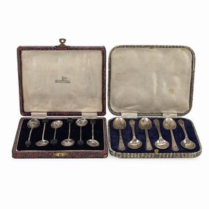 saliere 8x6x6 cm. XX Sec. composto da: 12 cucchiaini da caffè in argento, di fogge diverse, entro custodie 2 [..]