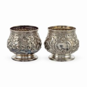 6,5x8x7 cm. Francia, prima metà del XIX Sec. di forma squadrata, sbalzate e decorate con motivi di volute, peso [..]