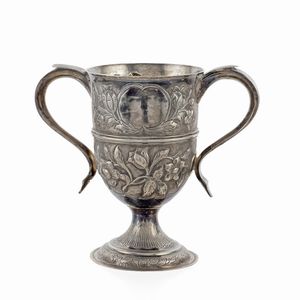 7x8 cm. Londra, 1890 orafo Tysall, forma circolare, corpo sbalzato e decorato con motivi floreali e vegetali, [..]