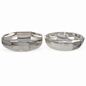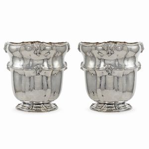 26,5x26x23 cm. Italia, XX Sec. coppia di rinfrescatoi in argento, corpo liscio a sezione ovale, profilo sbalzato [..]