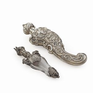 l. 21 - 15 cm. XIX Sec. - fiasca da viaggio in argento, Birmingham, 1887 - portaprofumo da viaggio in vetro e [..]
