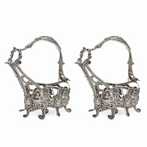 25x27x11 cm. Italia, XX Sec. coppia di porta bottiglia in argento, decorati e cesellati con motivi a voluta, [..]