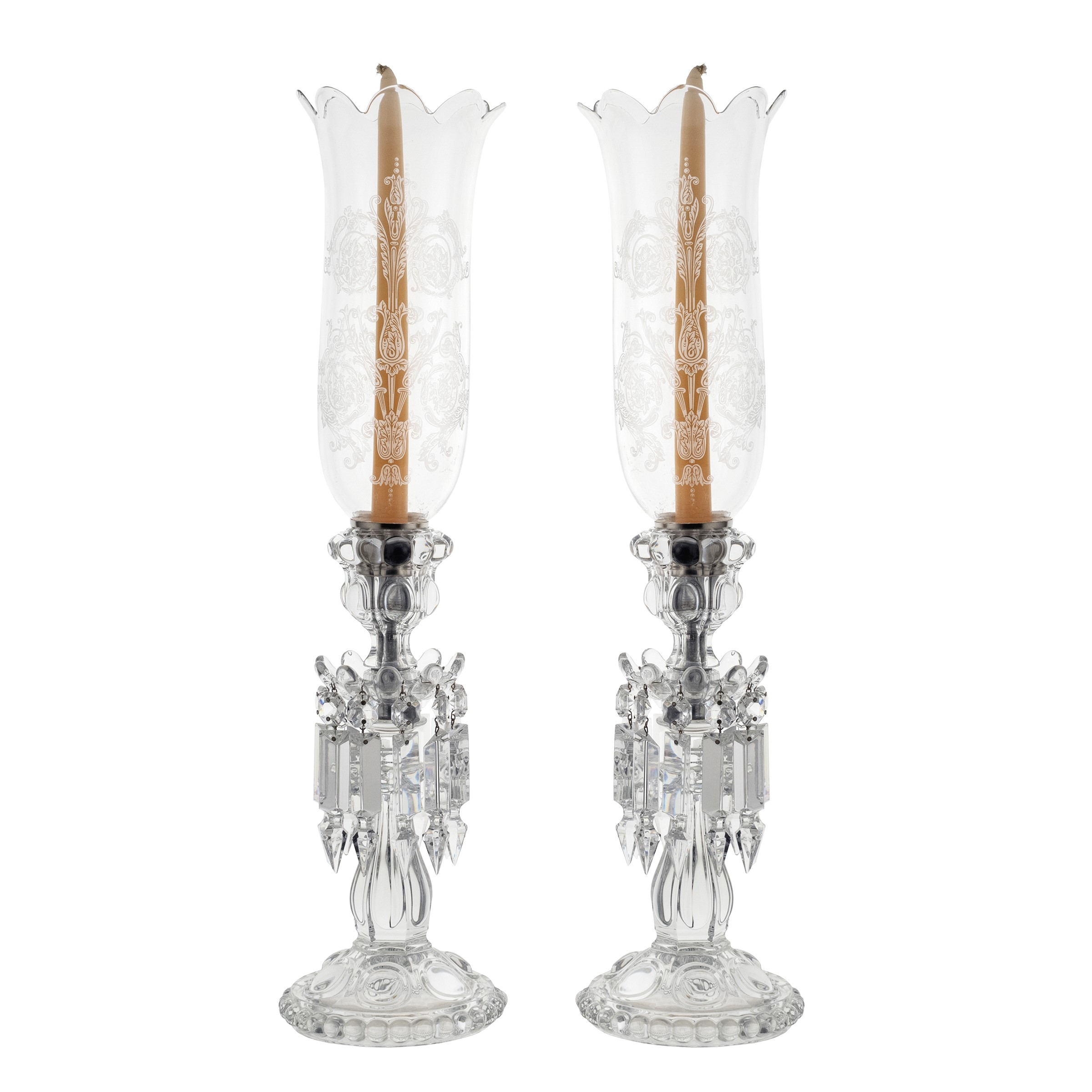 Francia, XX Sec. modello Bambou, in cristallo trasparente, diffusori decorati con motivi vegetali a roccailles poggianti su basi circolari con stelo a balaustro completo di pendenti, marchio della produzione