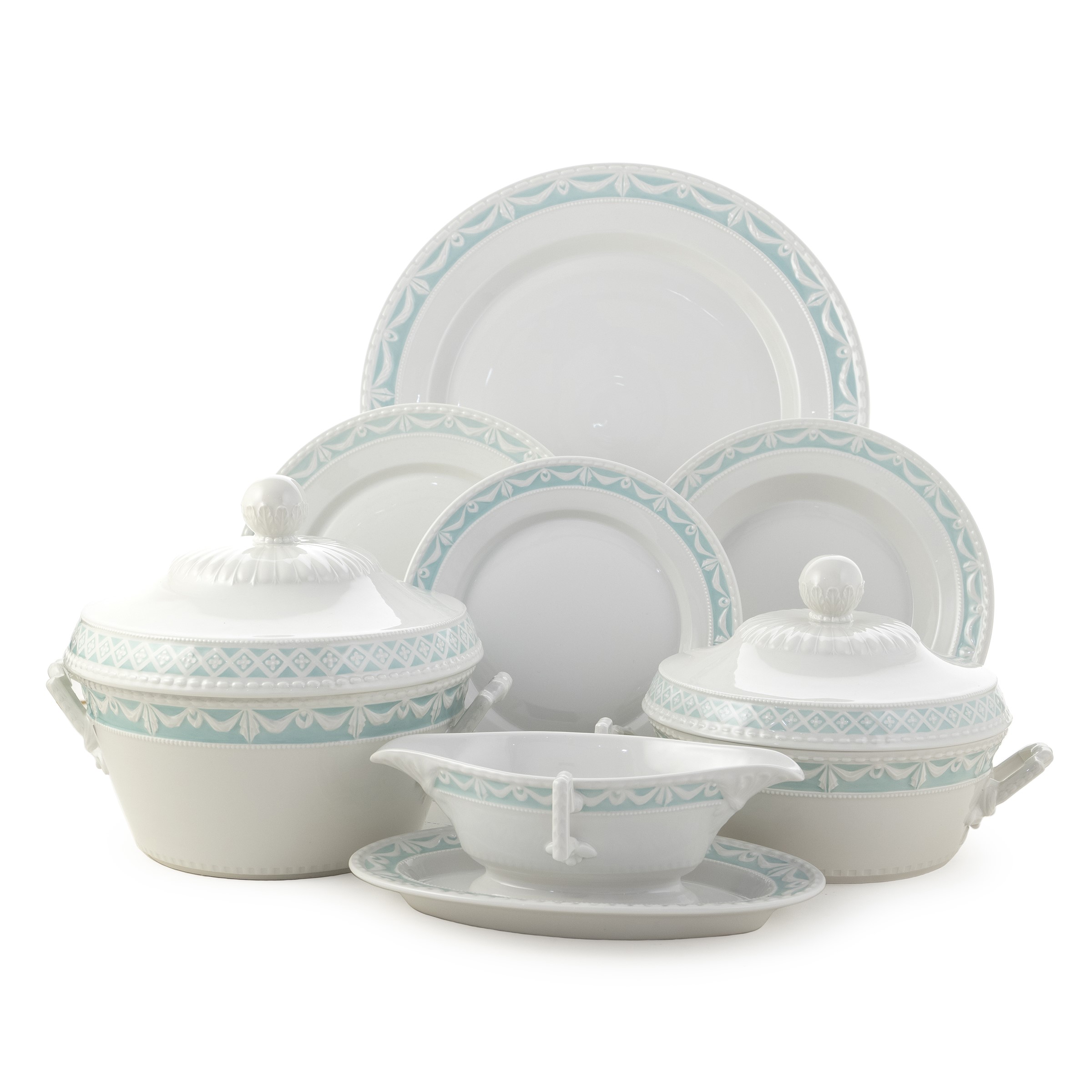 zuppiere 20x27 cm. - 18x23 cm. Germania, XX Sec. in porcellana con decoro a fascia monocromo verde acqua su fondo bianco, marchio della produzione. Composto da: 24 piatti piani 12 piatti fondi 12 piatti da frutta una zuppiera una legumiera una insalatiera 3 piatti ovali da portata 2 piatti circolari da portata una salsiera 2 raviere a foglia