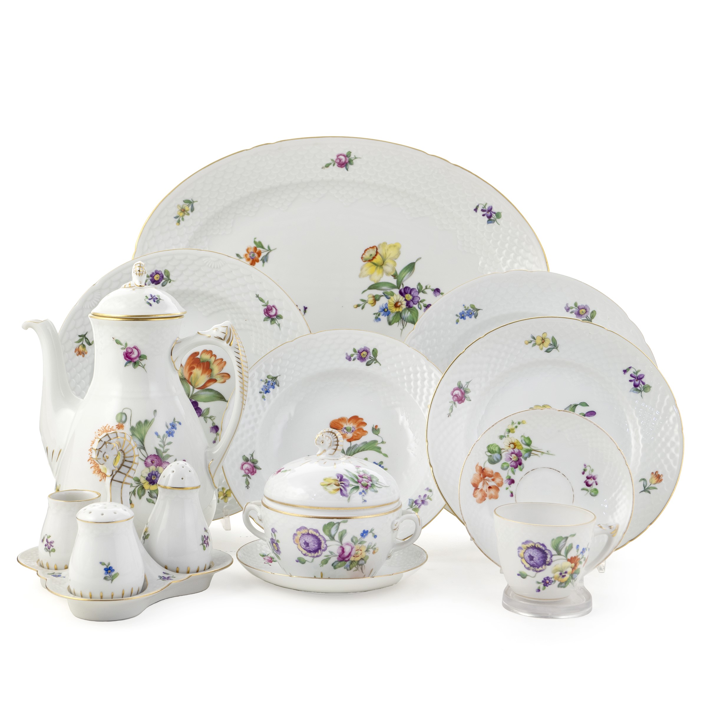 legumiera 18x26x22 cm. Danimarca, XX Sec. decoro Saxon Flower in porcellana policroma su fondo bianco, fascia decorata con motivo a cesto e profilo dorato, marchio della produzione, usure e difetti Composto da: 20 piatti piani 25 piatti fondi 25 piatti fondi medi 25 piatti da frutta 25 piattini da dolce 20 piattini da pane 2 legumiere 5 piatti ovali da portata 5 piatti circolari da portata 2 piatti rettangolari da portata 2 insalatiere 9 raviere misure diverse 2 piatti a foglia 4 salsiere una saliera una caffettiera 20 tazze da caffè con piattini 2 zuccheriere con coperchi e piattini 3 portastecchini