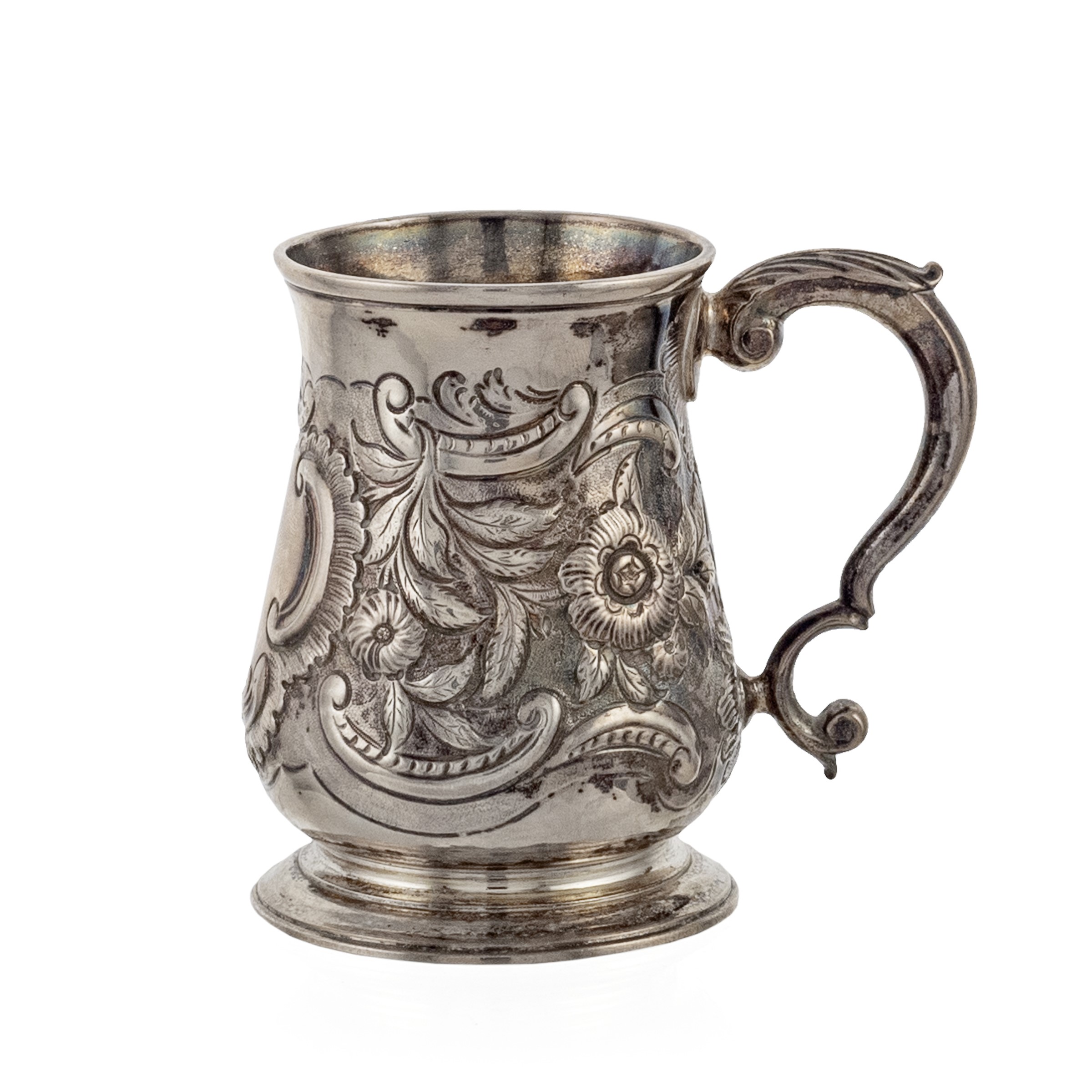 Londra, 1753 orafi Shaw & Priest, base circolare, corpo cesellato con motivi vegetali e floreali, manico sagomato, peso 242 gr.