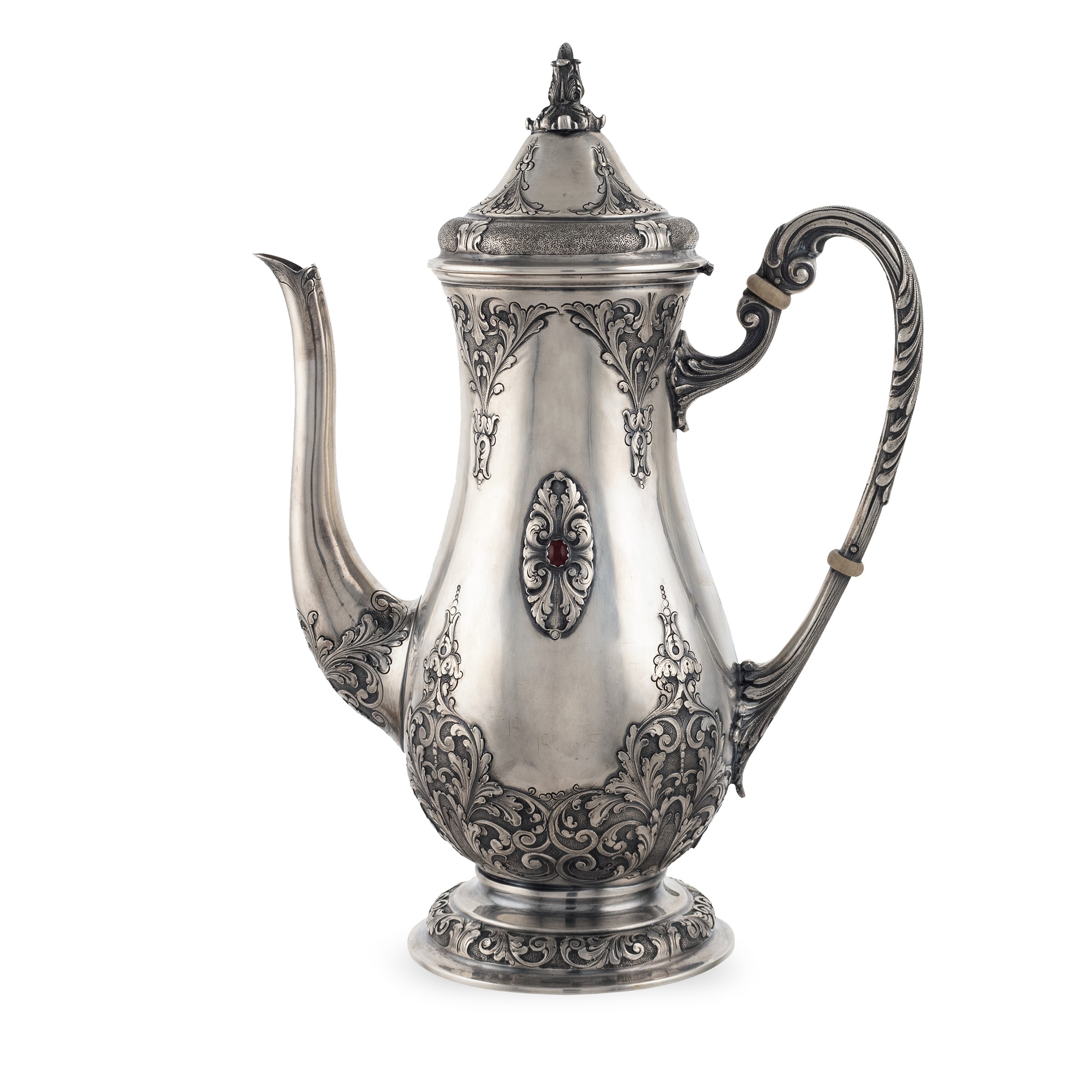 Italia, XX Sec. corpo piriforme su base circolare, decorato con motivi naturalistici, manico a voluta, peso 758 gr.
