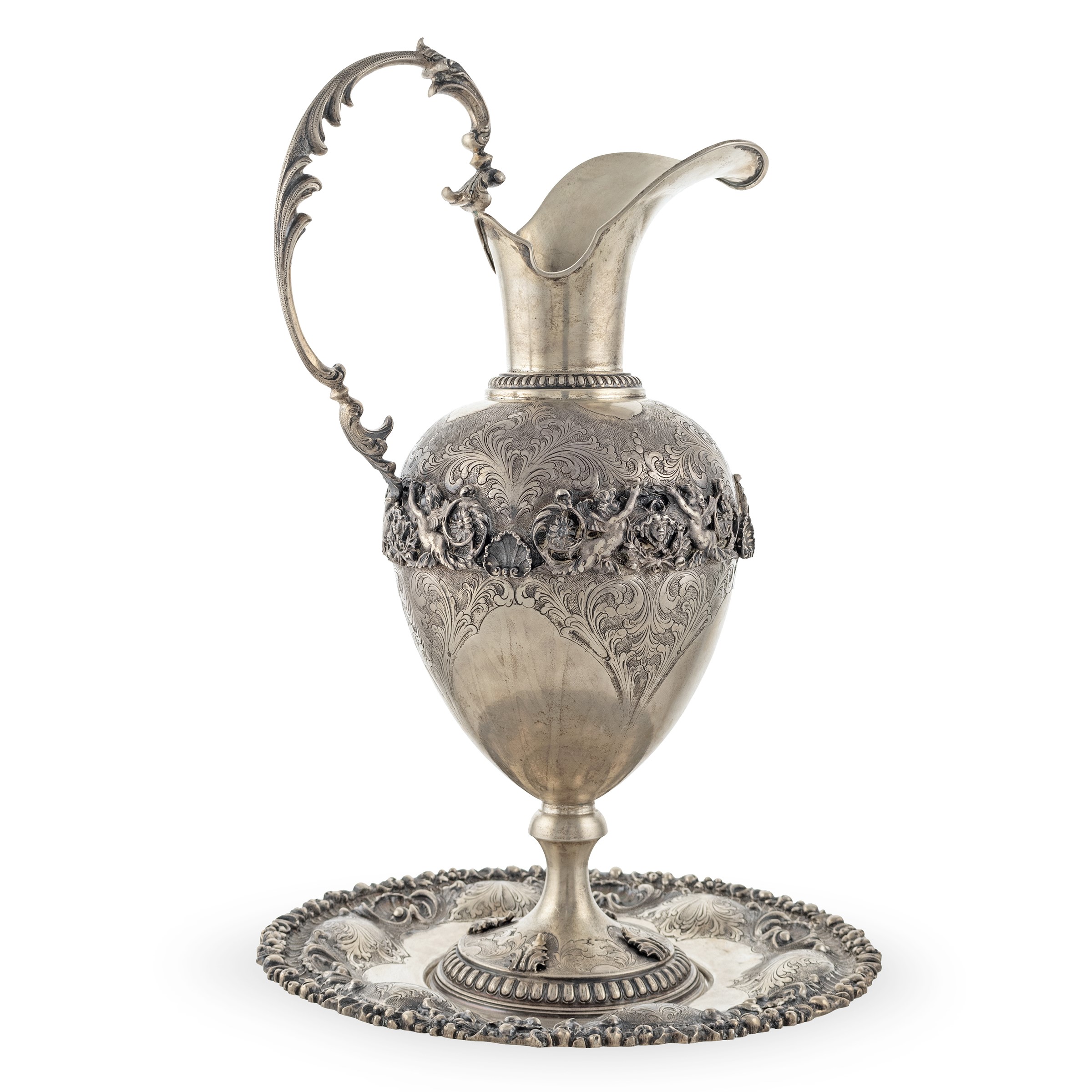 Italia, XX Sec. caraffa con base circolare, corpo bombato con superficie decorata a motivi di putti, conchiglie e motivi naturalistici, manico a voluta, bacile con analogo decoro, peso complessivo 1955 gr.
