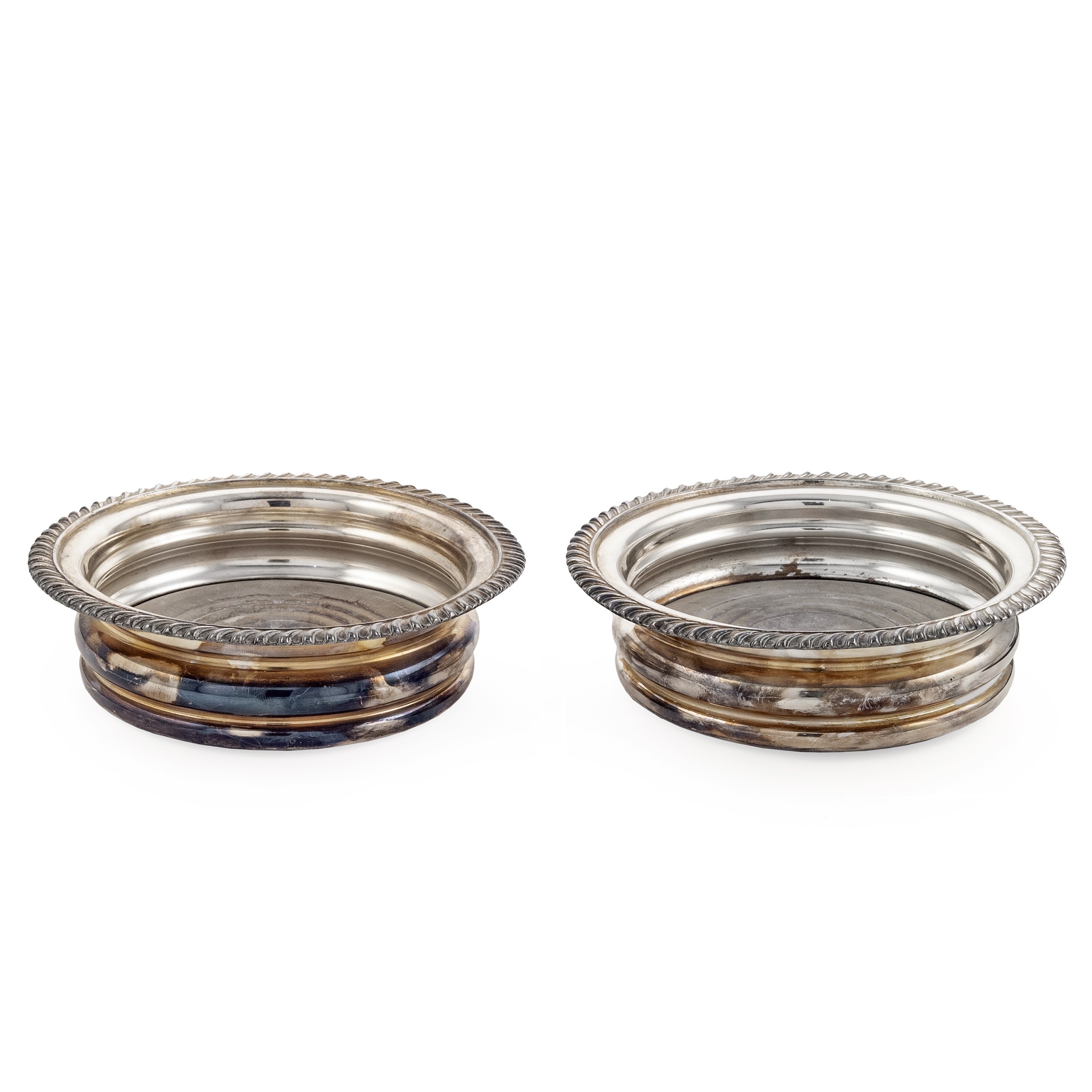 Coppia di sottobottiglia in metallo argentato e legno