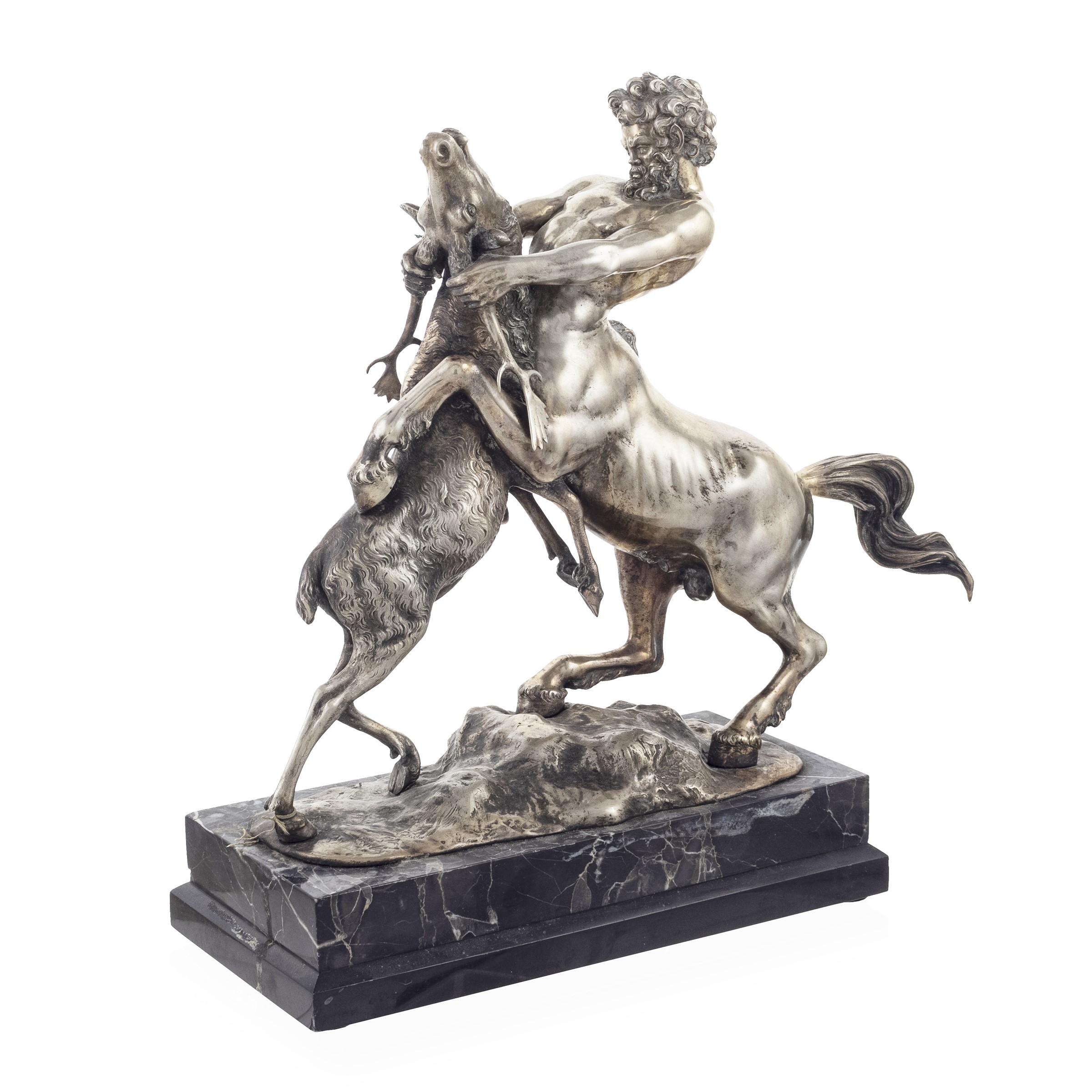 35x37x13 cm. Napoli, inizio XX Sec. raffigurante Il Centauro che uccide il Cervo, poggiante su base rettangolare in marmo, firmata sulla base, peso netto 3766 gr. Il gruppo è ispirato alla celebre poesia di Gabriele D'Annunzio La Morte del Cervo Provenienza: Roma, Collezione Petochi Bibliografia: Dawn of a New York. La New York World's Fair, 1939-1940