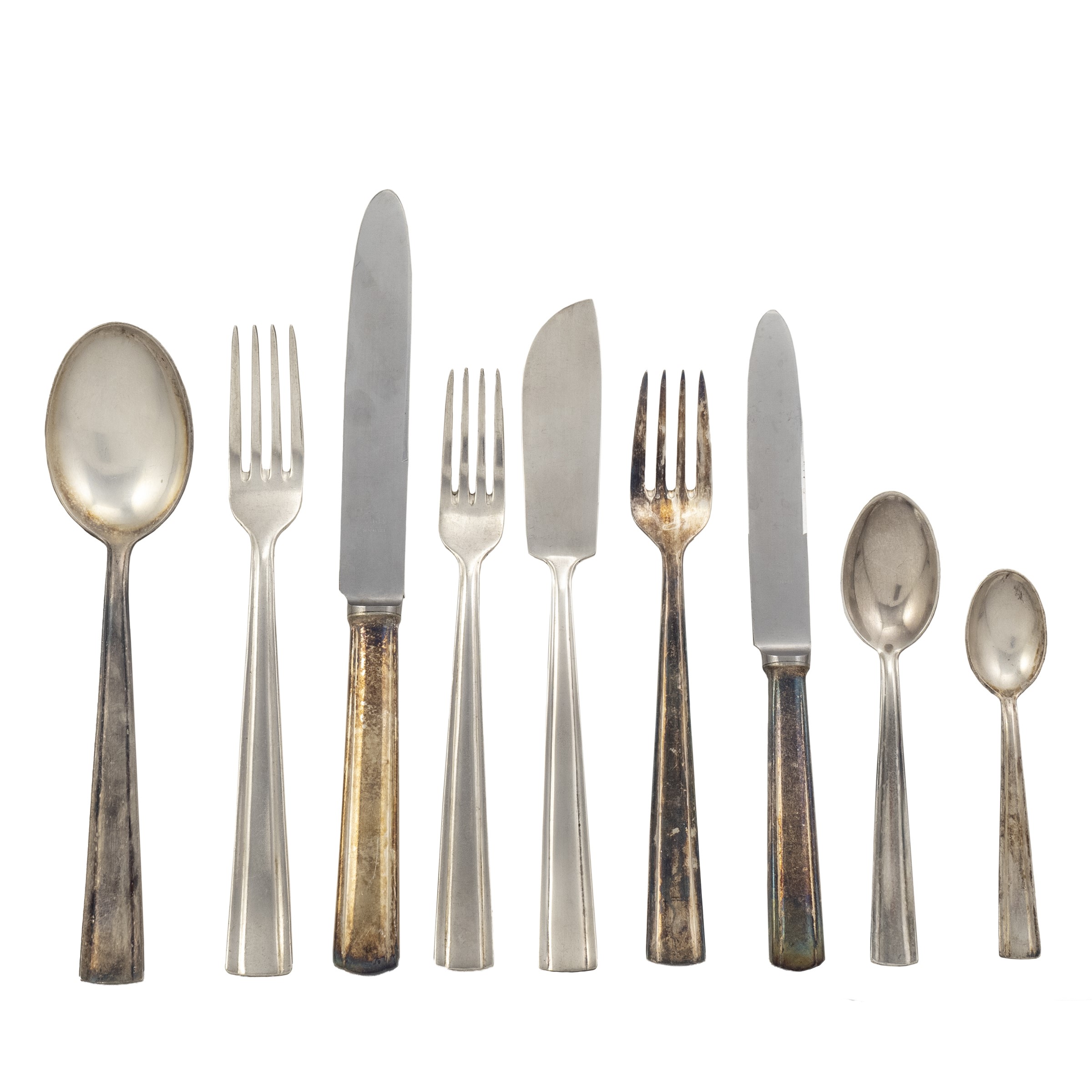 . Italia, anni 30/40 parte di servizio di posate in metallo argentato, marchio della produzione, composto da : 8 forchette 8 cucchiai 8 coltelli 8 forchette da pesce 8 coltelli da pesce 7 cucchiai da dolce 7 forchette da frutta 8 coltelli da frutta 7 cucchiaini 14 cucchiaini da caffè un mestolo