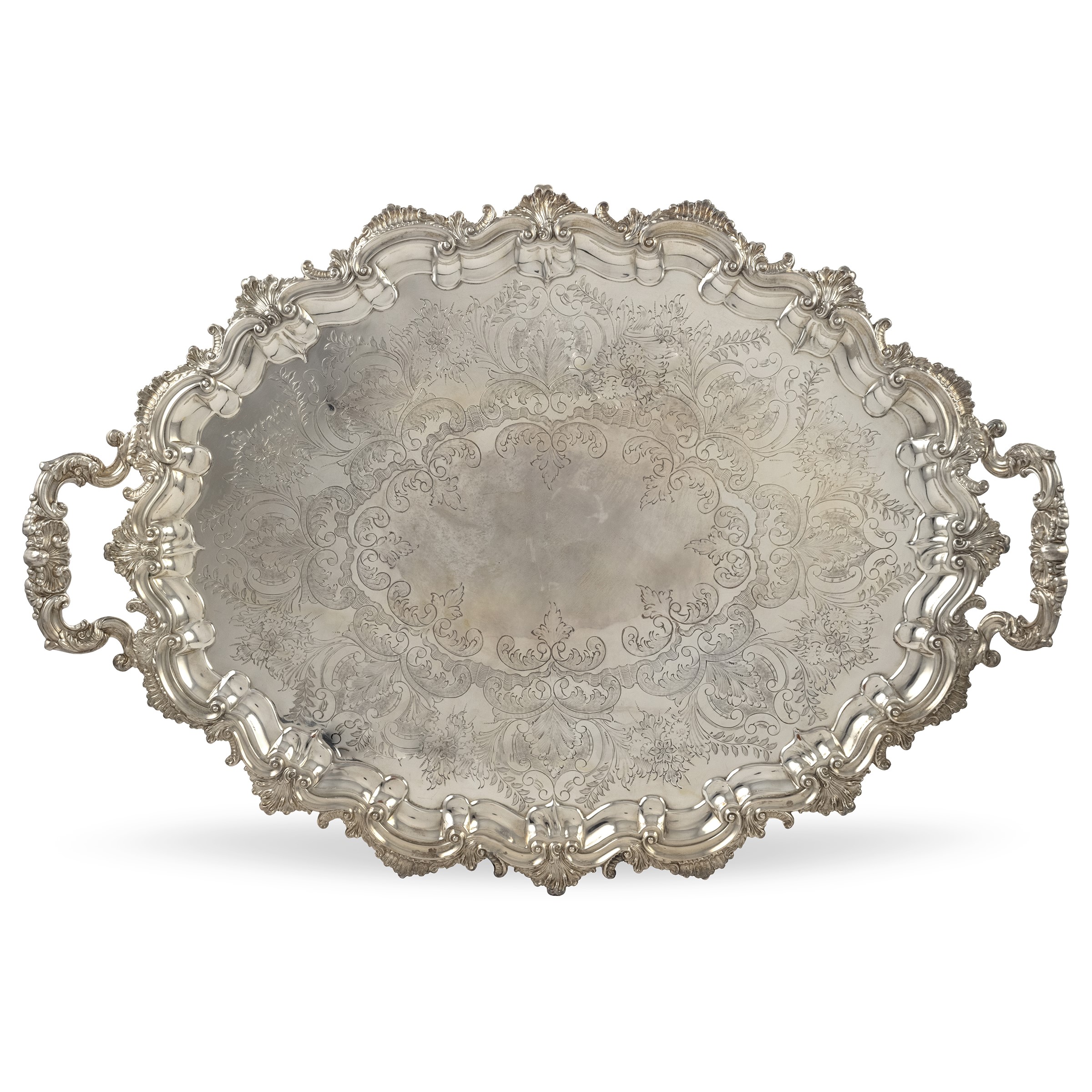 Inghilterra, XIX Sec. forma ovale con profilo sagomato e cesellato con motivi vegetali e floreali, poggiante su quattro piedini a voluta
