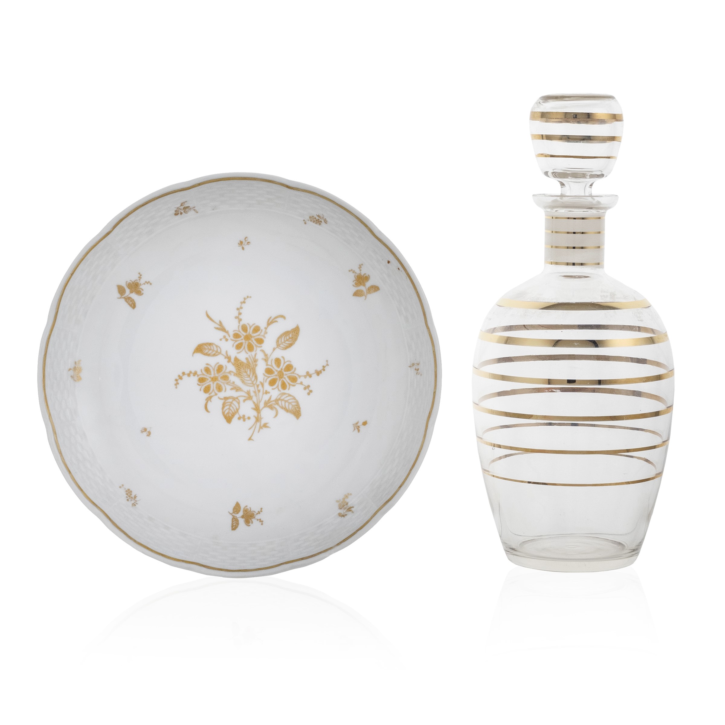 Italia, XX Sec. composto da un piatto Richard Ginori manifattura di Doccia e una bottiglia in vetro trasparente e dorato con tappo